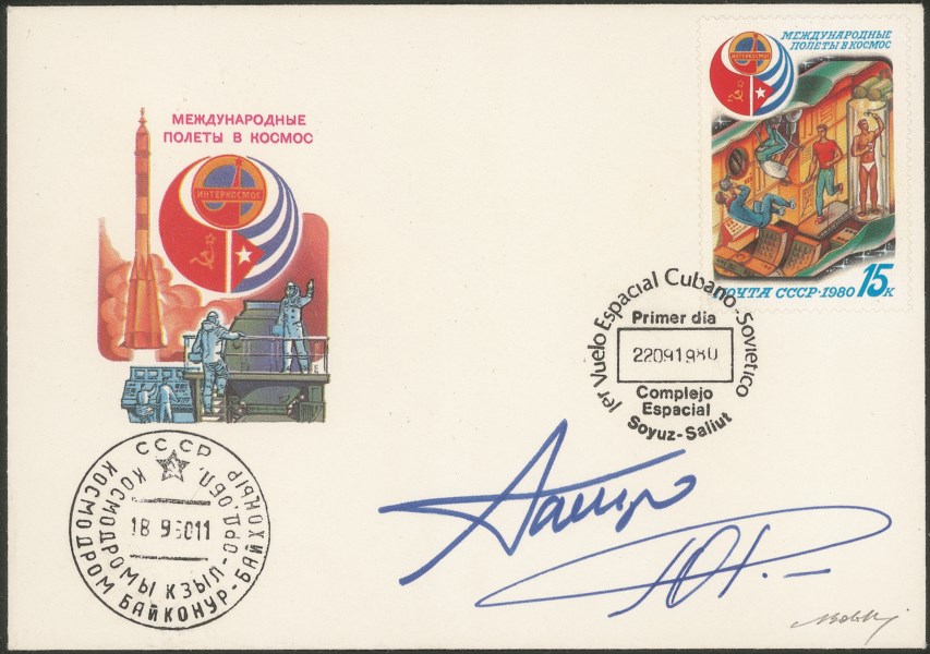 Cosmogramma del volo Intercosmos sovietico-cubano Soyuz 38 (18.9.-26.9.1980) - annullo Cosmodromo Baikonur 18.9.80, lancio, e annullo primo volo cubano-sovietico 22.09.1980 complesso spaziale Soyuz-Salyut apposto a bordo - firme autografe dei cosmonauti: Y.Romanenko e A.Mendez (primo cosmonauta da Cuba) - ottima qualità - Bolaffi + cert. Kniga + cert. Interkosmos