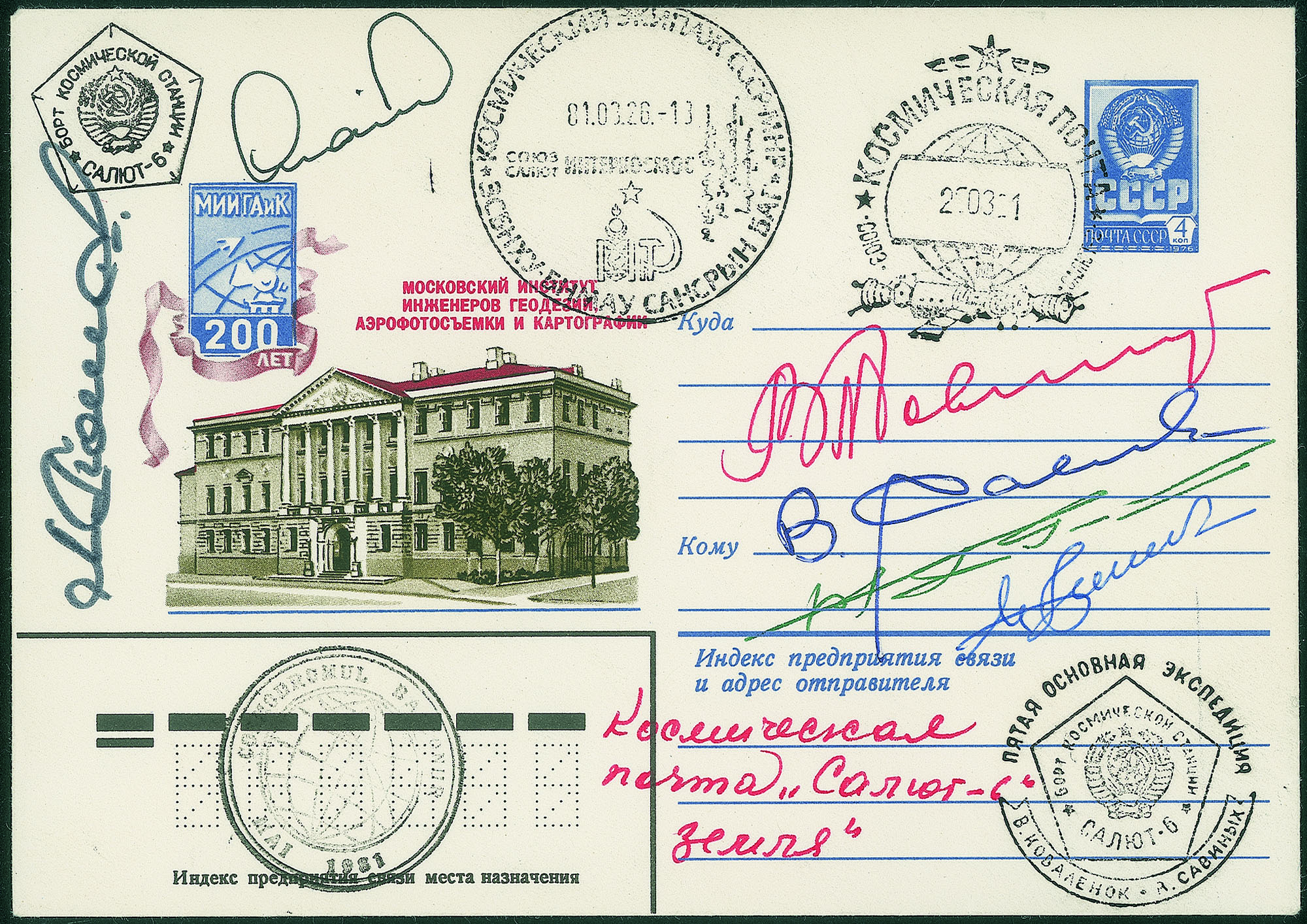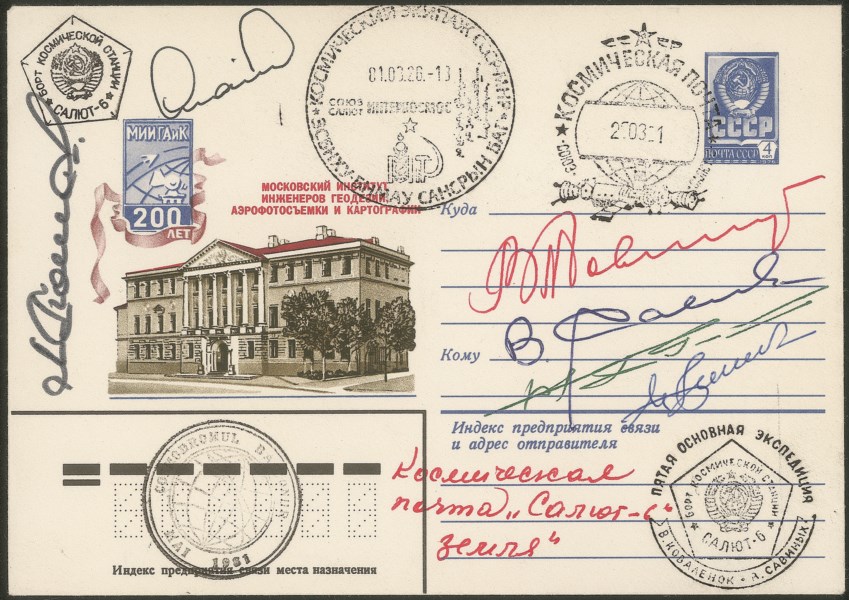 Cosmogramma del volo Soyuz T-4 (12.3.81-26.5.81) - bollo pentagonale nero di bordo Salyut-6, timbro ufficiale di bordo nero Posta spaziale bordo Salyut-6 27.03.81 timbro circolare nero rumeno Cosmodromo Baikonur maggio 81, timbro circolare pentagonale privato dei cosmonauti La quinta principale spedizione, Salyut-6 e timbro postale ufficiale della Mongolia Posta Spaziale del 26.3.1981 - firme autografe di 6 cosmonauti: V.Kovalenok e V.Savinykh (Soyuz T-4); V.Dzanibekov e J.Gourragtcha - Mongolia (Soyuz-39); L.Popov e D.Prunariu - Romania (Soyuz-40) - in rosso testo manoscritto di Kovalenok Posta spaziale Salyut-6 Terra - ottima qualità