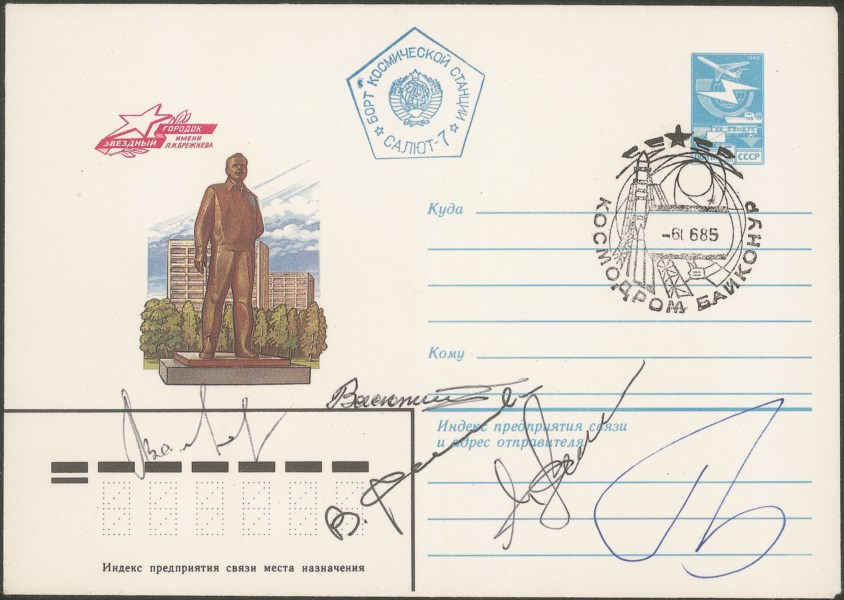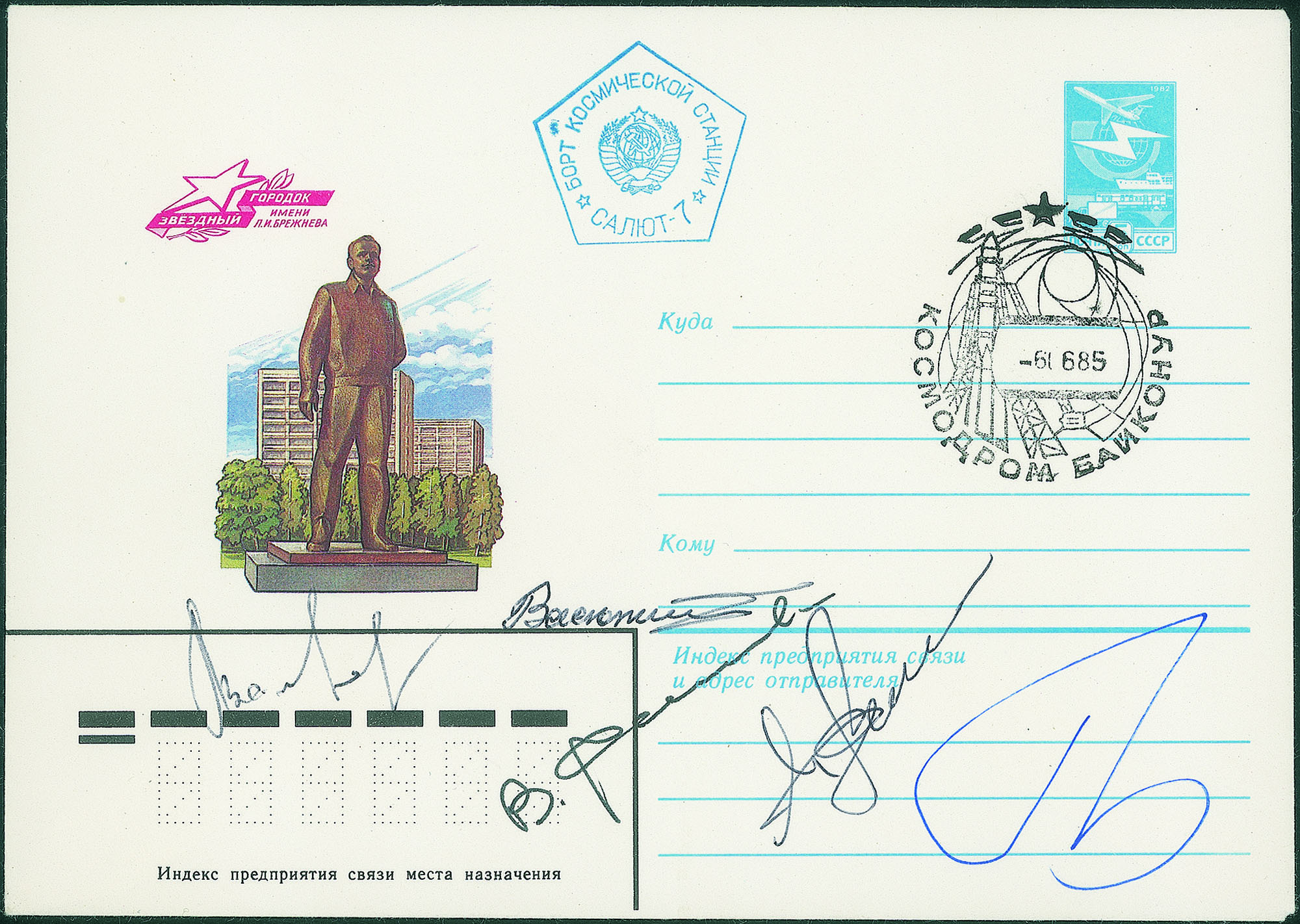 Cosmogramma del volo Soyuz T-13 partito il 6.6.1985 e ritornato con la stessa navicella ma con diverso equipaggio il 25.9.1985 - annullo Cosmodromo Baikonur 6.6.85, lancio, e bollo pentagonale di bordo Salyut-7 - firme autografe dell'equipaggio T-13, V.Dzhanibekov e V.Savinykh e di 3 cosmonauti, membri dell'equipaggio della Soyuz T-14, aggancio/Salyut-7 18.9.1985, V.Vasyutin, G.Grechko e A.VoIkov - ottima qualità e busta non comune - Bolaffi + cert. Kniga