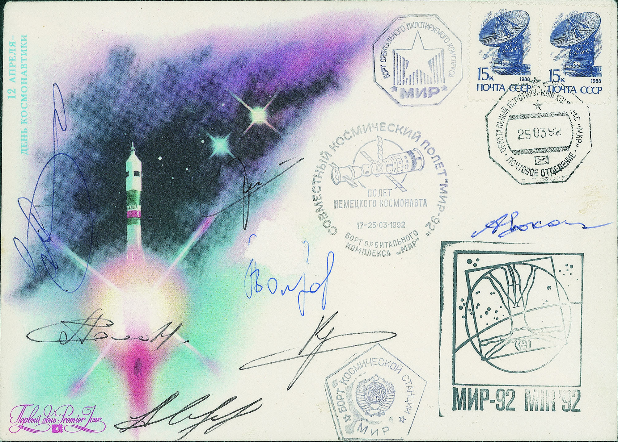 Cosmogramma del volo cooperato Russia Germania con i vari annulli della missione - firme autografe degli astronauti Krikalyov Volkov Viktorenko Kaleri Soloviev Avdeev e Tognini - ottima qualità