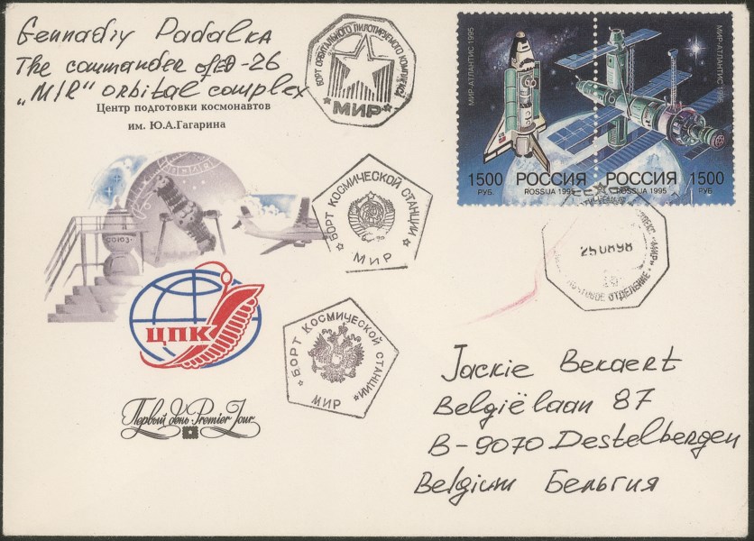 Cosmogramma con posta privata Spazio-Terra (uno dei 13 conosciuti) trasportato sulla Terra dalla Soyuz TM-27, scritto dal cosmonauta Gennadi Padalka a bordo della stazione - lettera annullata con gli annulli di bordo: l'ottagonale CC*CP 25.08.98, giorno del distacco Soyuz TM-27/Mir, bollo pentagonale, 2 tipi sulla busta e ottagonale stellare nero - la busta riporta al verso anche il bollo a secco della spedizione 26 - ottima qualità