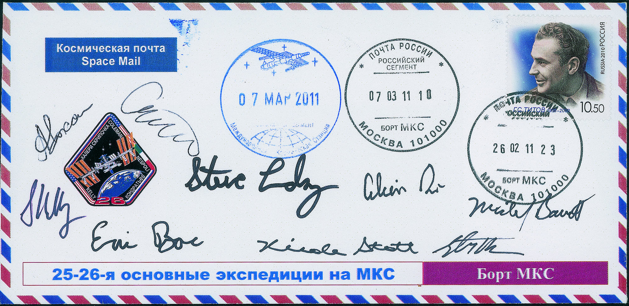 Cosmogramma commemorativo della missione con firme autografe di tutti i 9 astronauti A. Kaleri O. Skriposchka S. Kelly S. Lindsey E. Boe B. Drew S. Bowen M. Barratt e N. Stott - solo 5 conosciute con tutte le firme - molto bella e rara - cert. Astrophil