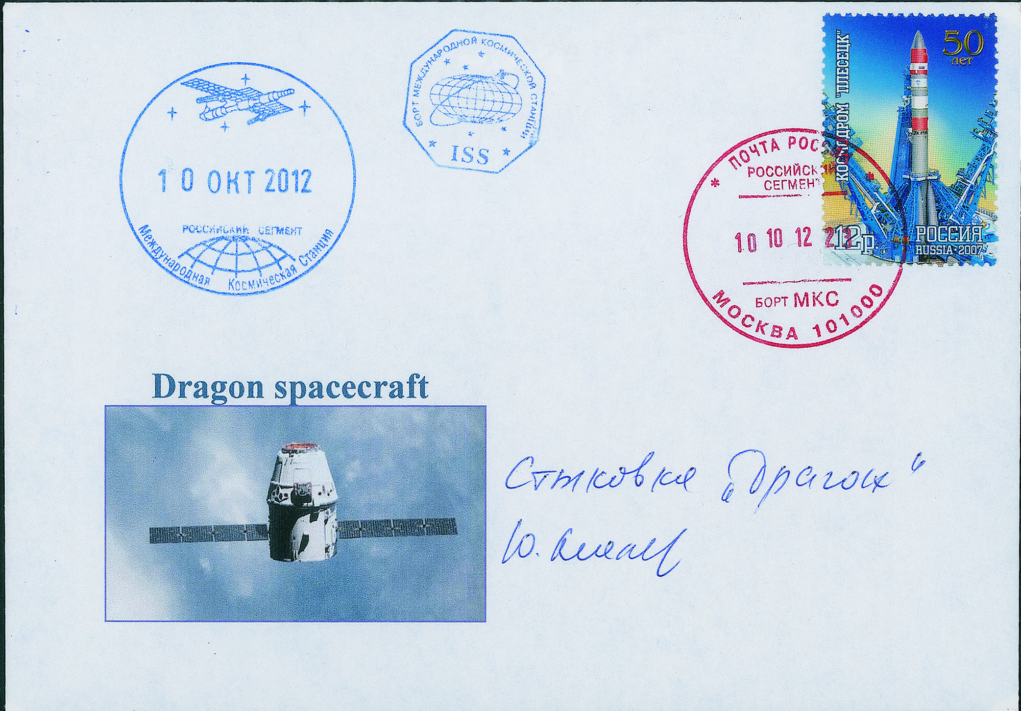 Cosmogramma timbrato con gli annulli di bordo della Stazione Spaziale Internazionale datati 10.10.2012, giorno in cui la navicella americana di rifornimento senza equipaggio Dragon CRS-1 agganciò la ISS - trattasi del primo volo commerciale sulla ISS di una navicella di rifornimento senza equipaggio Dragon - firma autografa del cosmonauta russo Y.Malenchenko, a bordo della ISS il giorno dell'aggancio della navicella Dragon CRS-1 - rara e di ottima qualità