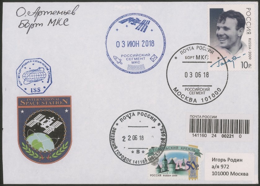 Cosmogramma spedito dalla Stazione Spaziale Internazionale alla Terra a bordo della Soyuz MS- 07 - lettera manoscritta dal cosmonauta russo O.Artemyev - lettera e testo (fronte e retro) furono timbrati con gli annulli di bordo + un timbro privato Soyuz MS-08. ISS 55/56 - al verso della busta dicitura manoscritta Soyuz MS-07 e firma autografa di O.Artemyev - dopo la consegna a Terra, la lettera fu inviata per raccomandata il 22.6.2018 al suo destinatario dal Centro di addestramento cosmonauti russo, al verso bollo di arrivo del 24.6.2018 - molto bella e di ottima qualità - foto di autenticità dallo spazio - cert. Rodin