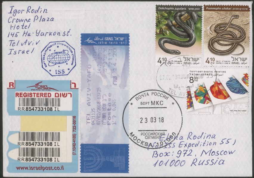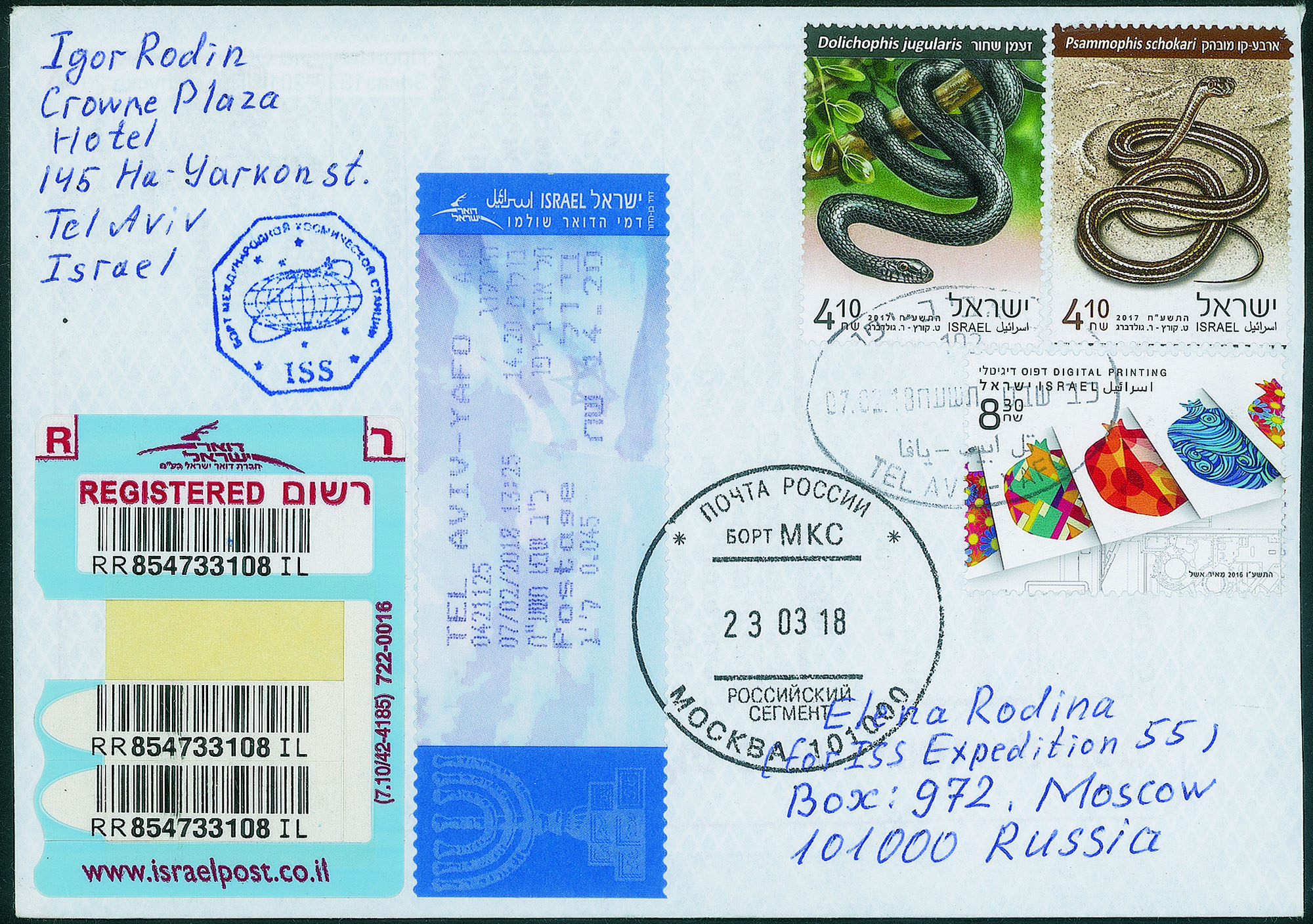 Cosmogramma spedito dalla Terra alla Stazione Spaziale Internazionale a bordo della navicella russa Soyuz MS-08 - prima la lettera fu spedita per raccomandata da Tel Aviv (Israele) in Russia (ricevuta della raccomandata inclusa) - lettera timbrata con gli annulli di bordo - il cosmonauta O.Artemyev ha scritto una nota al verso della lettera: È consegnata alla ISS dalla navicella Soyuz MS-08 - molto bella - foto di autenticità dallo spazio - cert. Rodin
