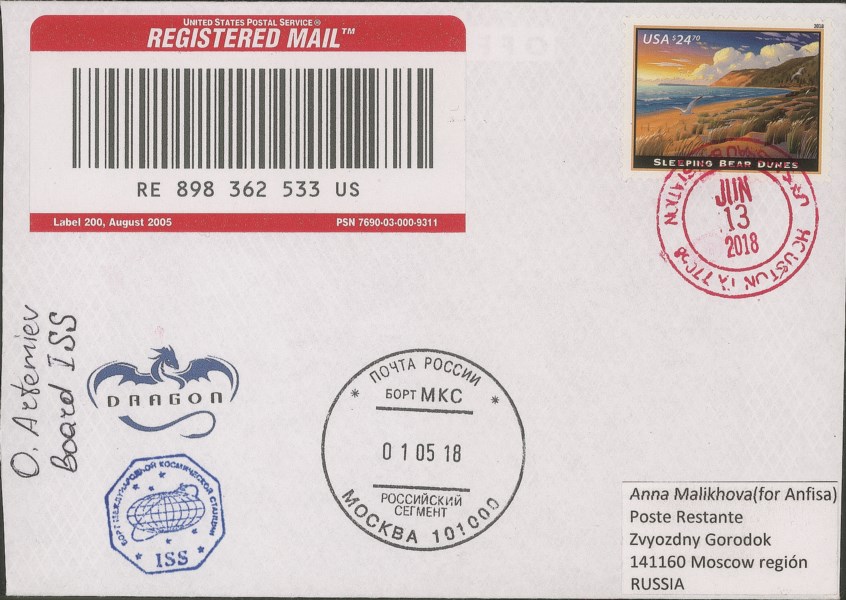 Cosmogramma spedito dalla Stazione Spaziale Internazionale sulla Terra a bordo della navicella di rifornimento senza equipaggio americana Dragon CRS-14 - lettera timbrata con gli annulli di bordo datati 1.5.2018, giorno in cui i portelli tra la Dragon e la ISS furono chiusi per il distacco - dopo l'arrivo a Terra, la lettera fu consegnata a un rappresentante russo alla NASA e spedita per raccomandata da Houston a Città delle Stelle, Russia (Centro di addestramento per cosmonauti russi) - ottima qualità - foto di autenticità dallo spazio - cert. Rodin