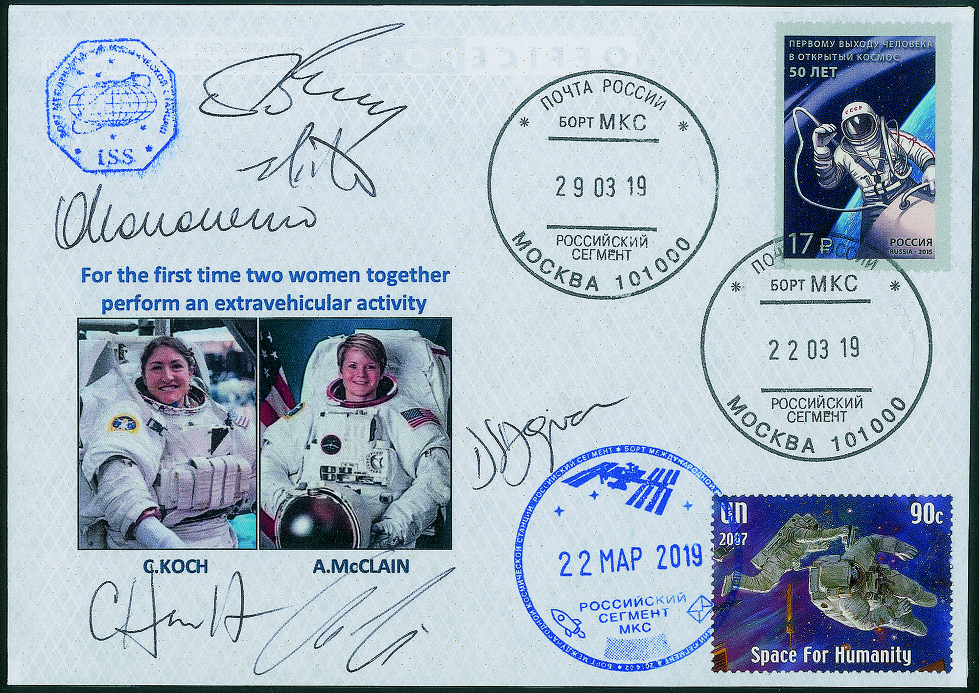 Busta preparata dalla NASA per comunicare la prima EVA mondiale (attività extra veicolare) di 2 donne - l'EVA fu eseguita da C.Koch e N.Hague e il 29.3.2019 da A.McClain e N.Hague - la busta è autografata da tutti gli astronauti che lavorarono a bordo della ISS il 22.3.2019 e il 29.3.2019: gli americani T. Nick Hague, C.Koch e A.McClain, i russi A.Ovchinin e O.Kononenko, il canadese D.Saint-lacques - ottima qualità