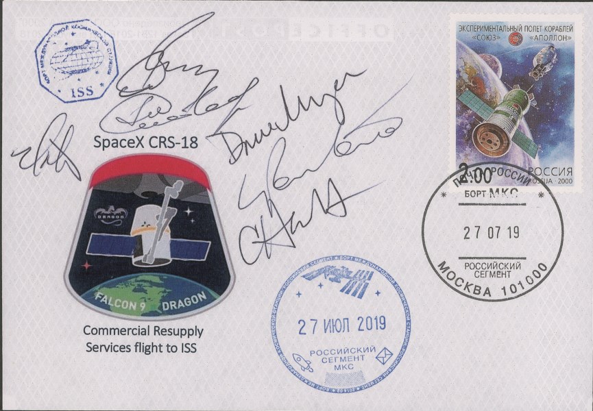 A bordo della Stazione Spaziale Internazionale il cosmogramma viene timbrato con gli annulli di bordo datati 27.7.2019, giorno in cui la navicella americana di rifornimento senza equipaggio Dragon CRS-18 si aggancia alla ISS - firme autografe degli astronauti che erano a bordo il 27.7.2019: il russo A.Ovchinin e gli americani T.Hague e C.H.Koch (ex Spedizione 59); il russo A.Skvortsov, l'italiano Luca Parmitano e l'americano A.R.Morgan - ottima qualità