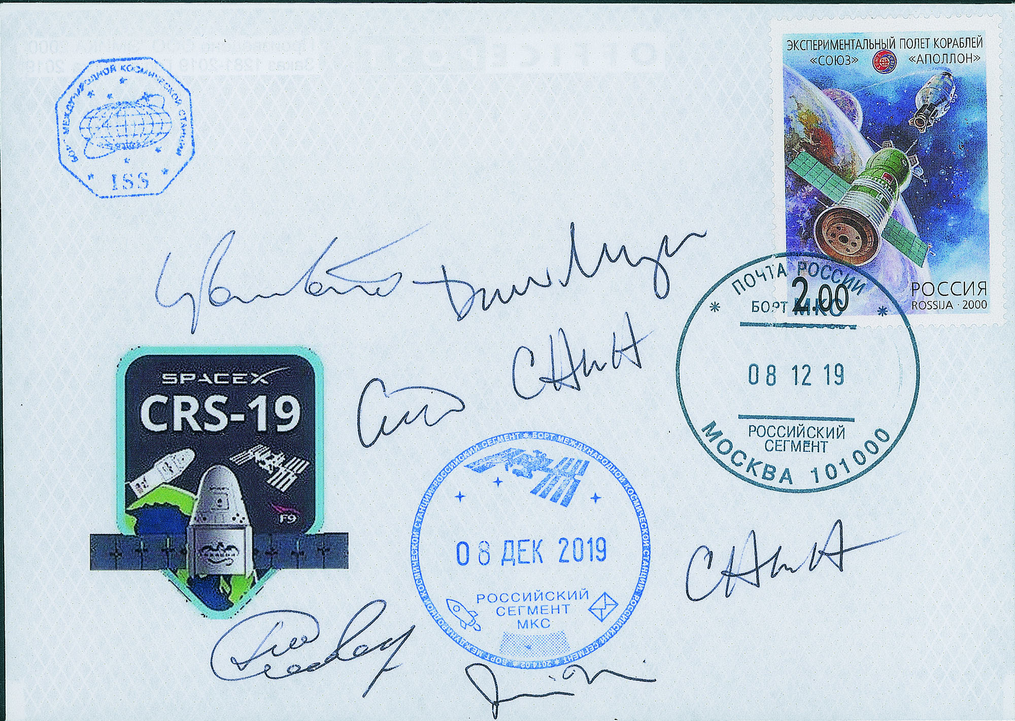Cosmogramma timbrato con gli annulli di bordo datati 08.12.2019, giorno in cui la navicella americana di rifornimento senza equipaggio Dragon CRS-19 agganciò la ISS - 6 firme autografe: equipaggio Soyuz MS-13, A.Skvortsov (Russia), Luca Parmitano (Italia) e A.Morgan (USA); equipaggio Soyuz MS-15, O.Skripochka (Russia), J.Meir (USA) e Hazzaa Al Mansoori (UAE) - ottima qualità