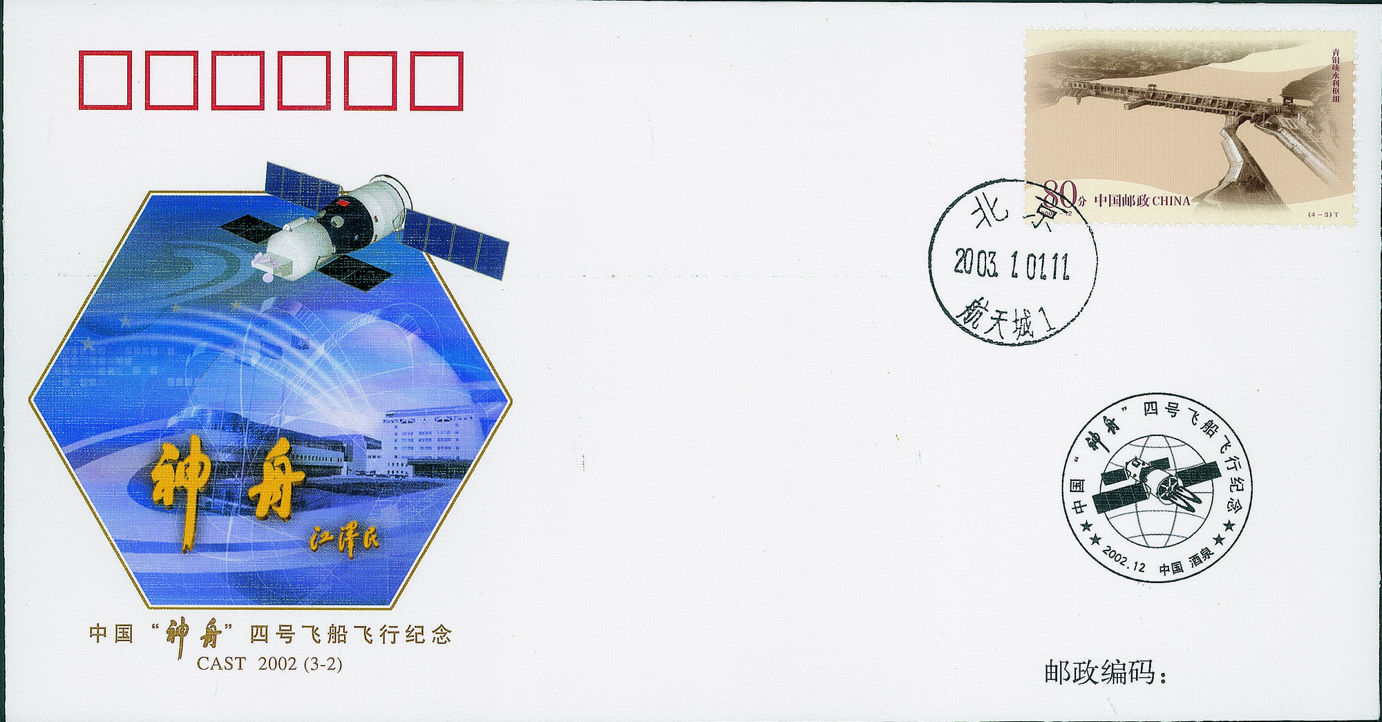 Quarta missione (30.12.2002 - 5.1.2003) di un veicolo spaziale di tipo Shenzhou del programma spaziale cinese, l'ultima senza equipaggio umano e che rappresentò il test finale prima del primo volo umano cinese - cosmogramma ufficiale n.0212378 di 400 buste volate (n.0212001-0212400), emesso dalla China Academy of Space Technology (CAST) con anullo del 29.11.2002, bollo a secco dell'ufficio notarile e dell'8.1.2003 al verso - la busta volata è accompagnata da 2 buste commemorative - rara e di ottima qualità - cert. notarile in cinese