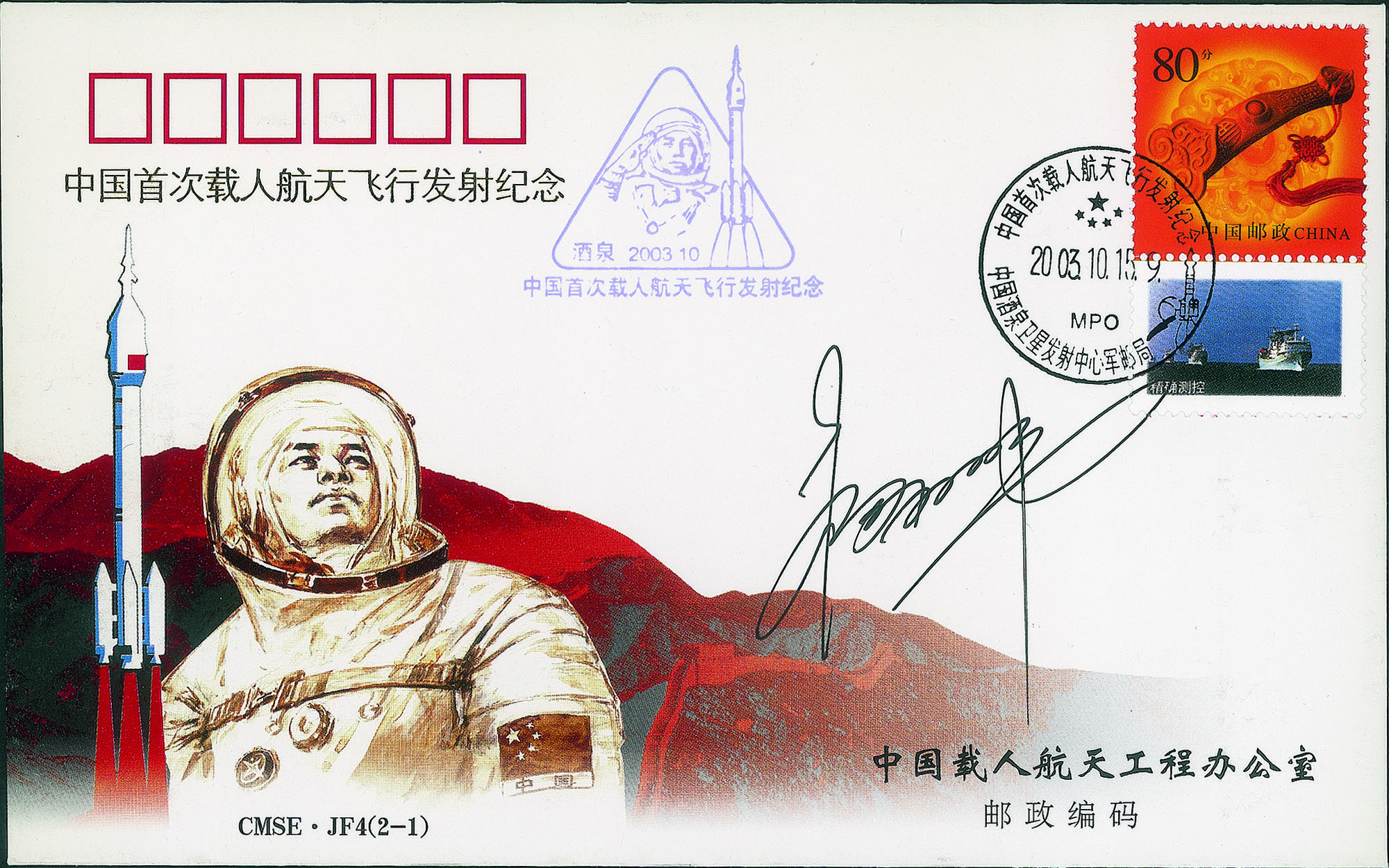 Primo volo umano cinese (15.10.2003), comandante Yang LiWei - cosmogramma ufficiale n.138 di 200 emesso dal Beijing Aerospace Post Office con ann. del 6.9.2003 e 18.10.2003 al verso - al recto in rosso il raro red spaceship cachet 2003.10.18 + bollo a secco dell'ufficio notarile - allegata busta commemorativa con data di lancio del 15.10.2003 emessa da CMSE con firma autografa del comandante Yang LiWei - la Cina diventò così la terza nazione al mondo a effettuare voli spaziali umani - rara e di ottima qualità - cert. notarile in cinese
