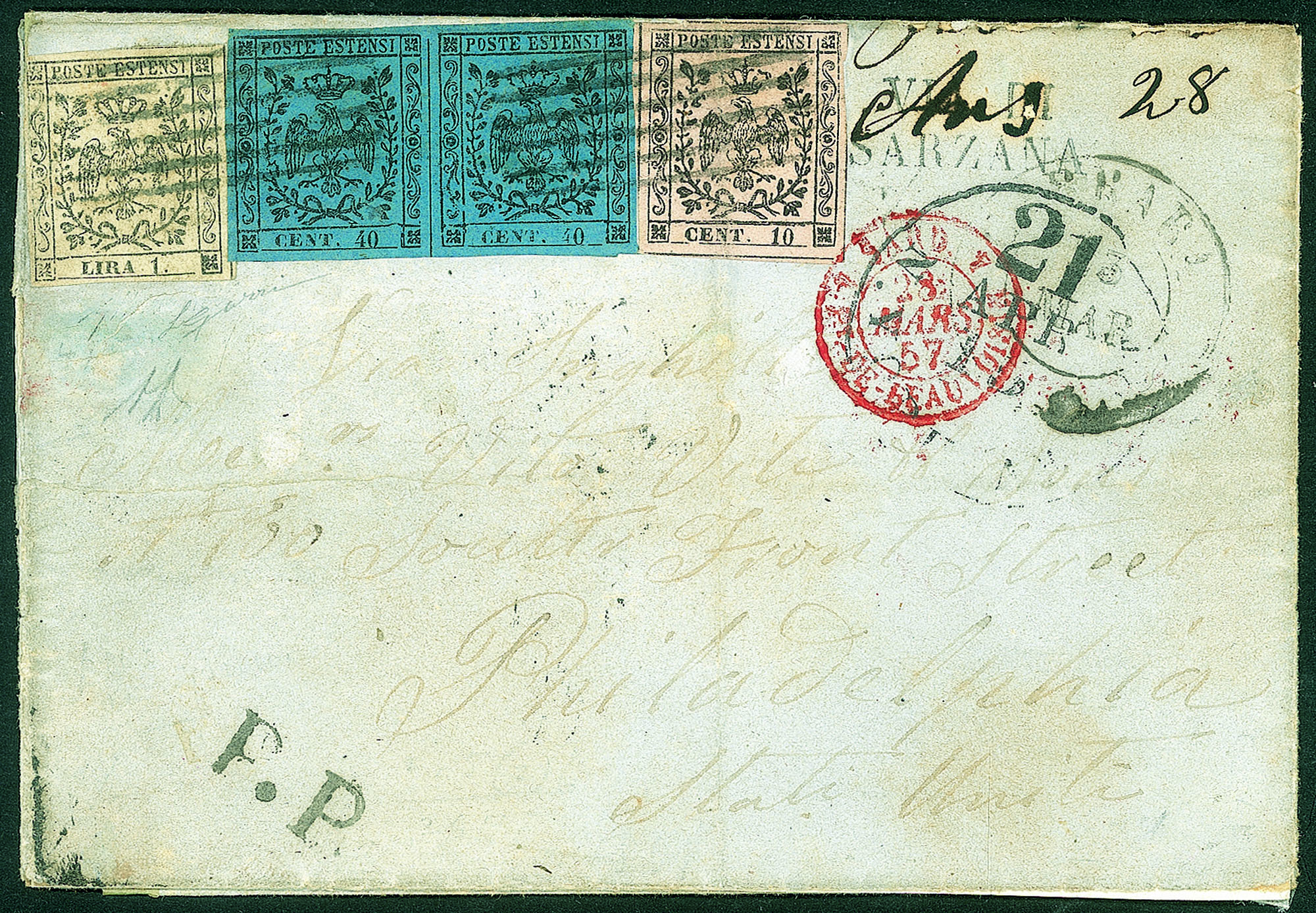 Antichi Stati Italiani - Modena - Tricolore composta da 10 cent + coppia del 40 cent + 1 lira (2 + 6 + 11)