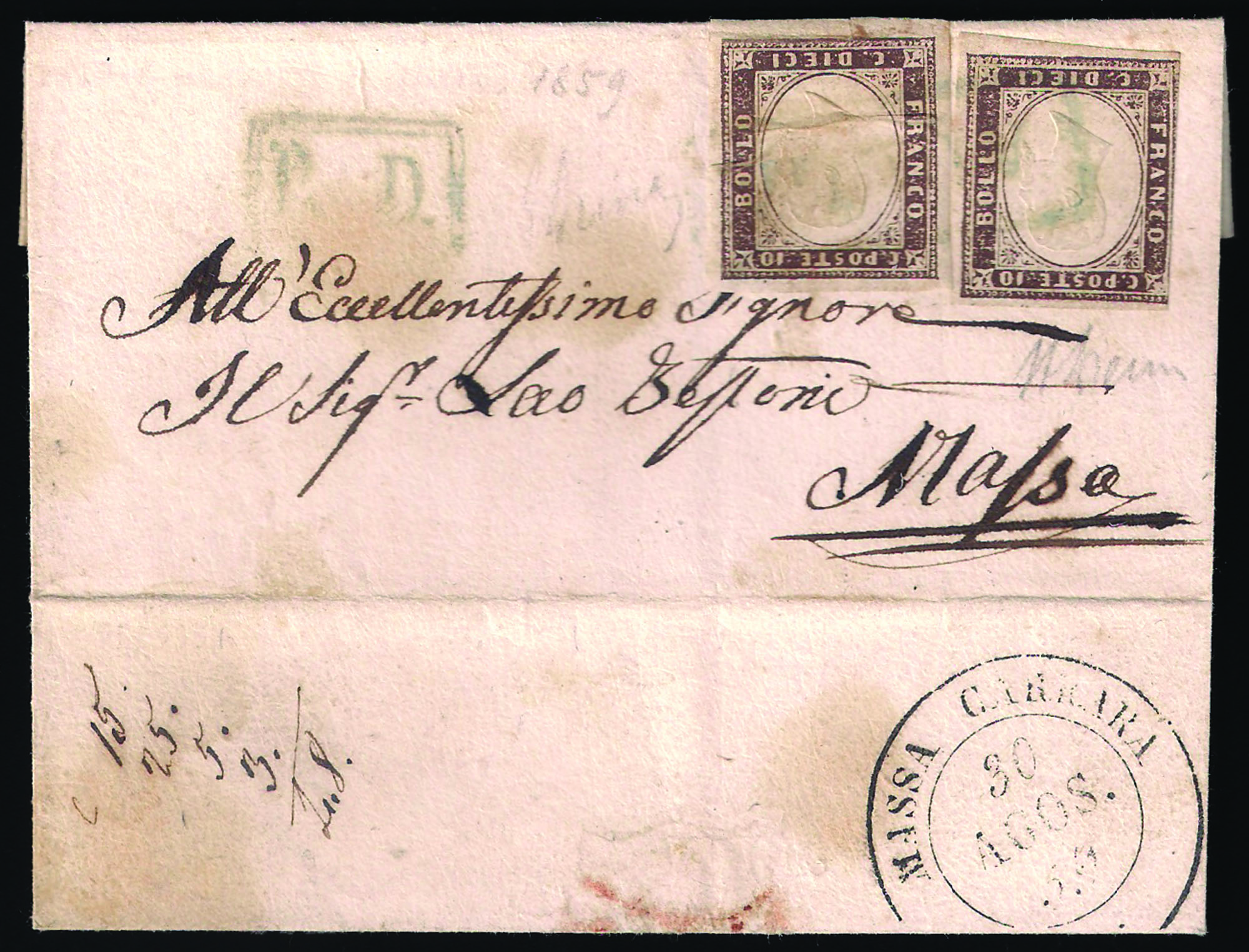 Difetti, annullati col bollo in cartella azzurra di AULLA e a lato il P.D. diretta a Massa, al verso bollo di arrivo del 30.8.1859, raro uso in periodo di Governo Provvisorio, firma per esteso A.Diena, E.Diena