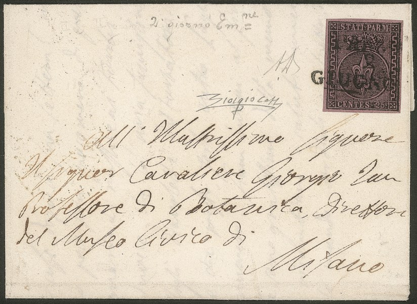 Trattasi del 2° giorno d'emissione dei francobolli del Ducato di Parma e del 1° giorno d'uso del 25 cent - splendido e di grande rarità storico postale - AD + cert. Colla