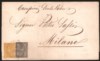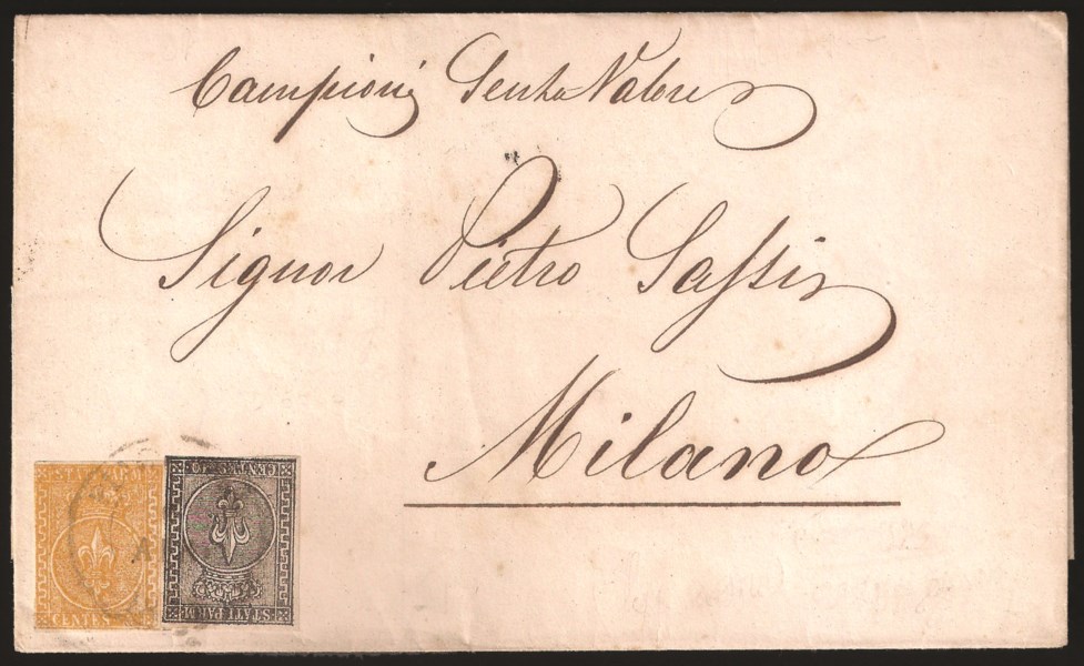 Da PIACENZA 6 APR.1853 per Milano con Manoscritto Campione senza valore e al verso il bollo in cartella PORTALETTERE 4 DISTRIBUZIONE, rara