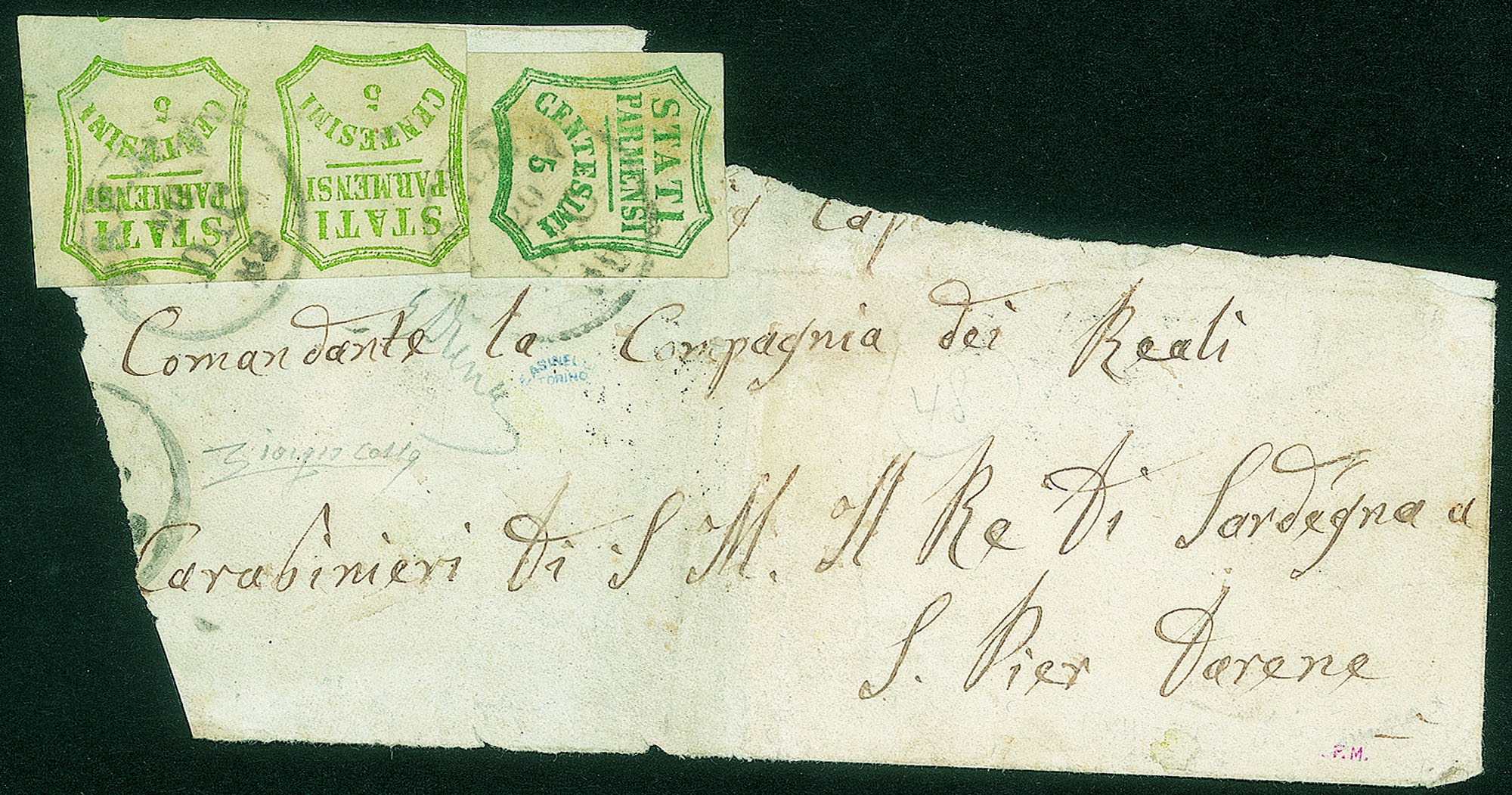 Antichi Stati Italiani - Parma - Governo Provvisorio - Grande frammento di lettera affrancata con coppia del 5 cent verde giallo (13)