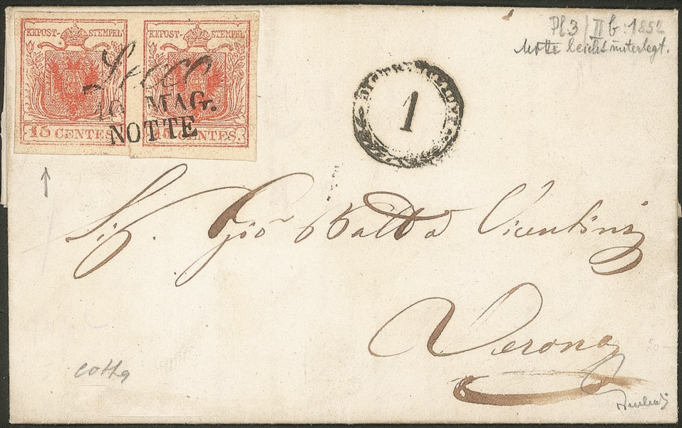 Affrancata con coppia molto ben marginata del 15 cent rosa carminio (5a) - Lecco notte cor. (P.ti 6) - Colla + Ferchenbauer