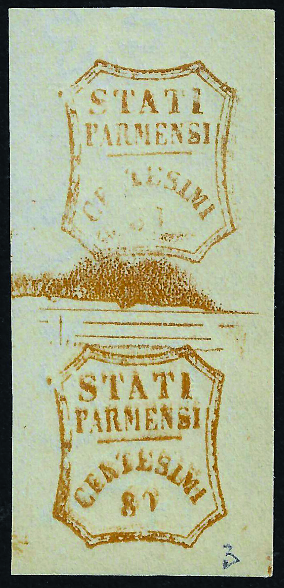 Bistro in coppia verticale con riquadro di clichè, l'esemplare inferiore con doppia stampa spostata verticalmente su carta lucida bianca