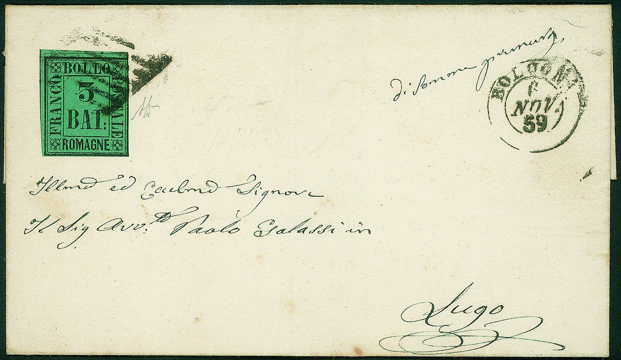Isolato su lettera da Bologna per Lugo del 6.11.59 - corto in alto a destra - cert. A. Diena