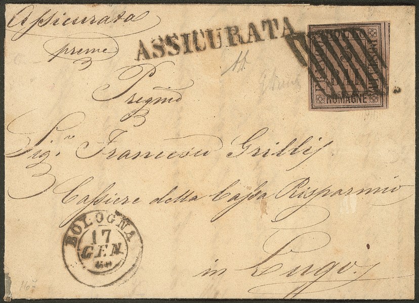 Antichi Stati Italiani - Romagne - Assicurata affrancata con 5 bai violetto (6)