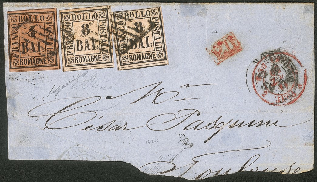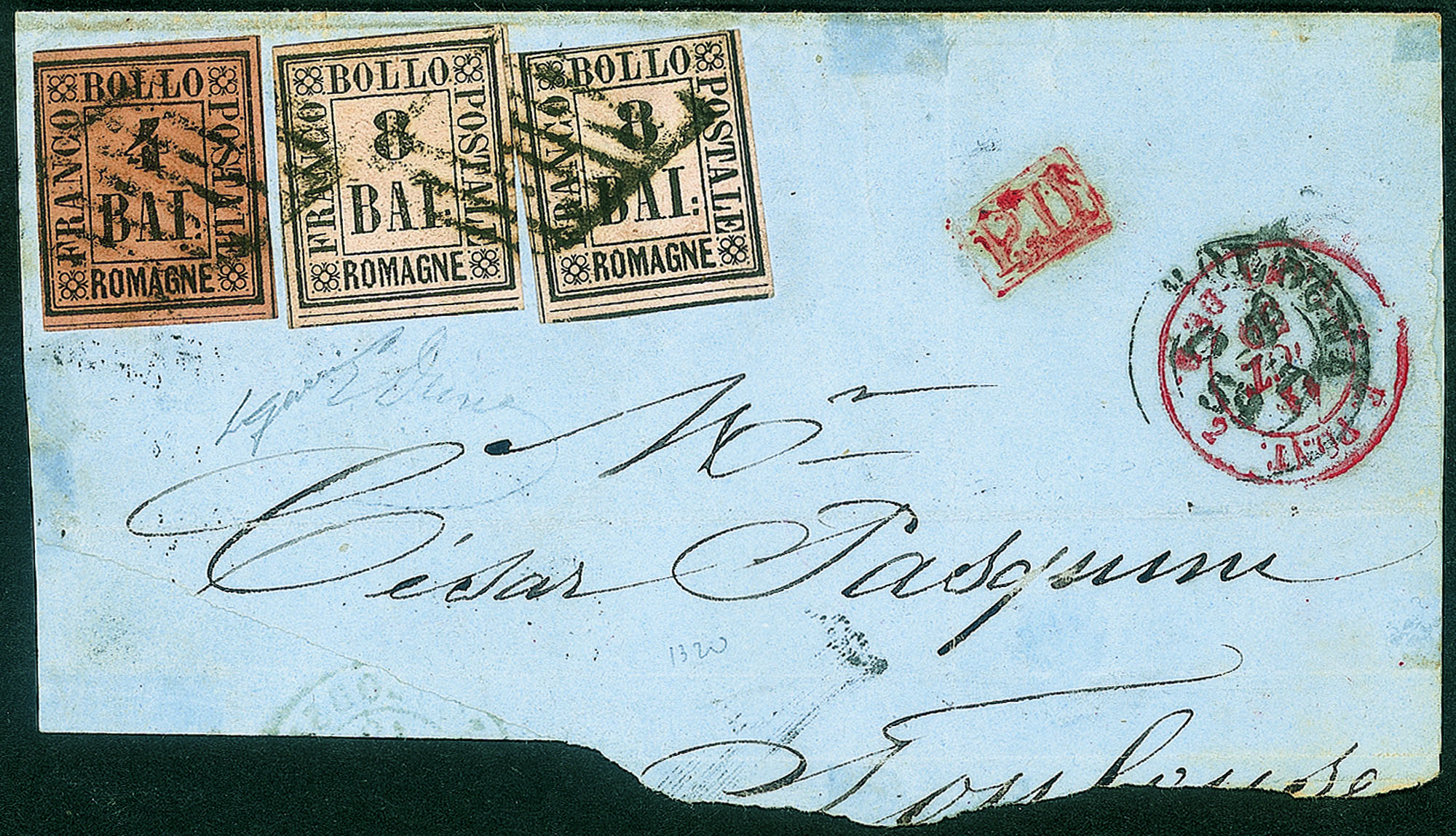 Antichi Stati Italiani - Romagne - Grande frammento di lettera con affrancatura bicolore composto da un 4 bai (5) più due 8 bai (8)