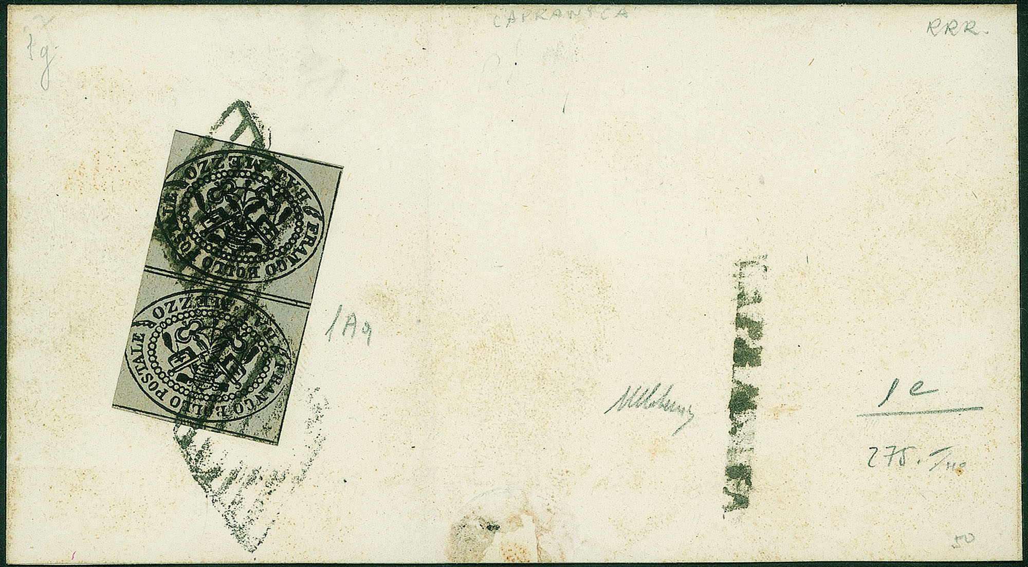 Su involucro di lettera affrancata con coppia del 1/2 baj violetto (1Aa) per Ronciglione del 30.7.62 - cert. Catania