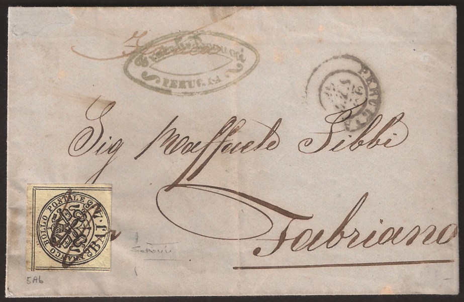 Per Fabriano affrancata con b.4 giallo chiaro (5Aa) annullato a penna, firma Sottoriva