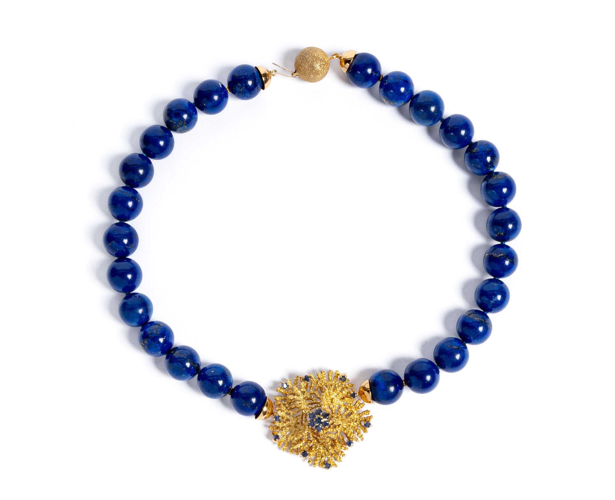Composed of a strand of lapislazuli spheres of 14 mm each, with a floral inspired yellow gold centerpiece embellished with small sapphires