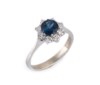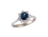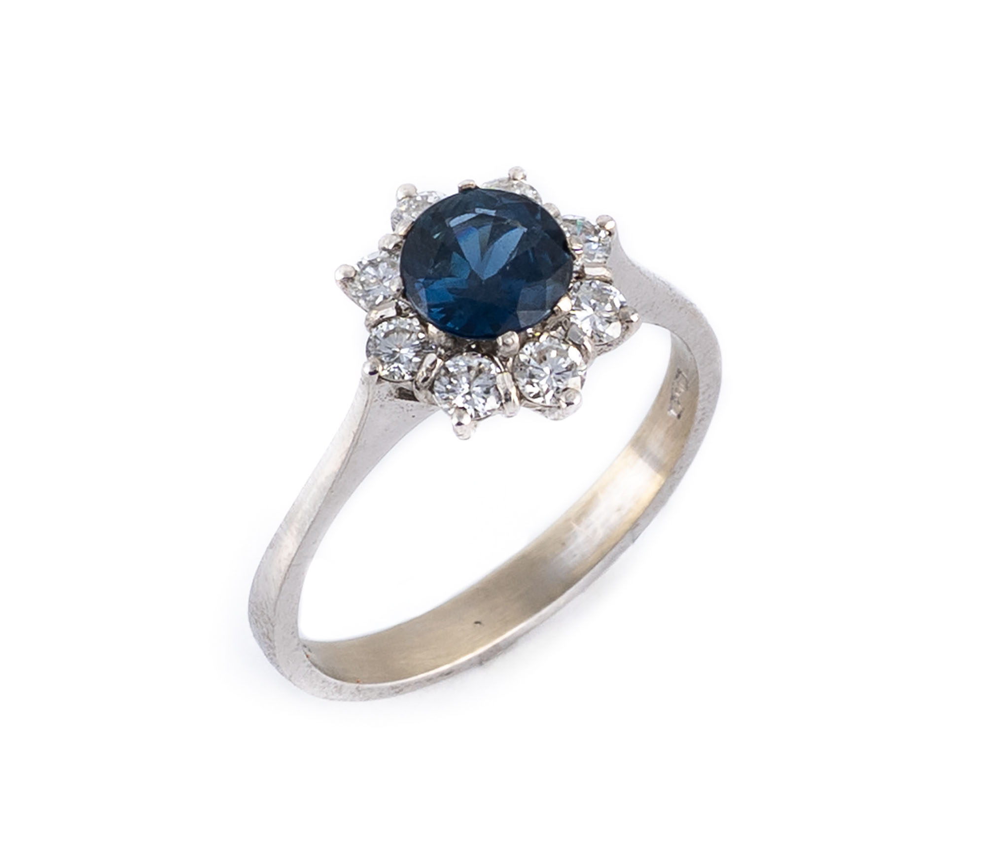 18kt white gold ring with round-cut sapphire of ct 0.80 ca surrounded by brilliant-cut diamonds of ct 0.55 ca