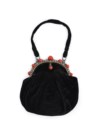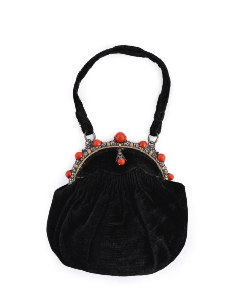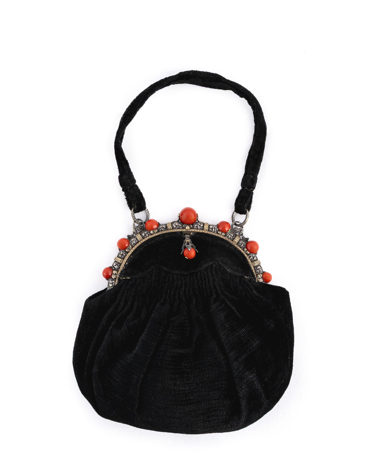 Soft black velvet bag with a gathered top and silver frame featuring finely perforated and chiseled decoration embellished with red coral beads