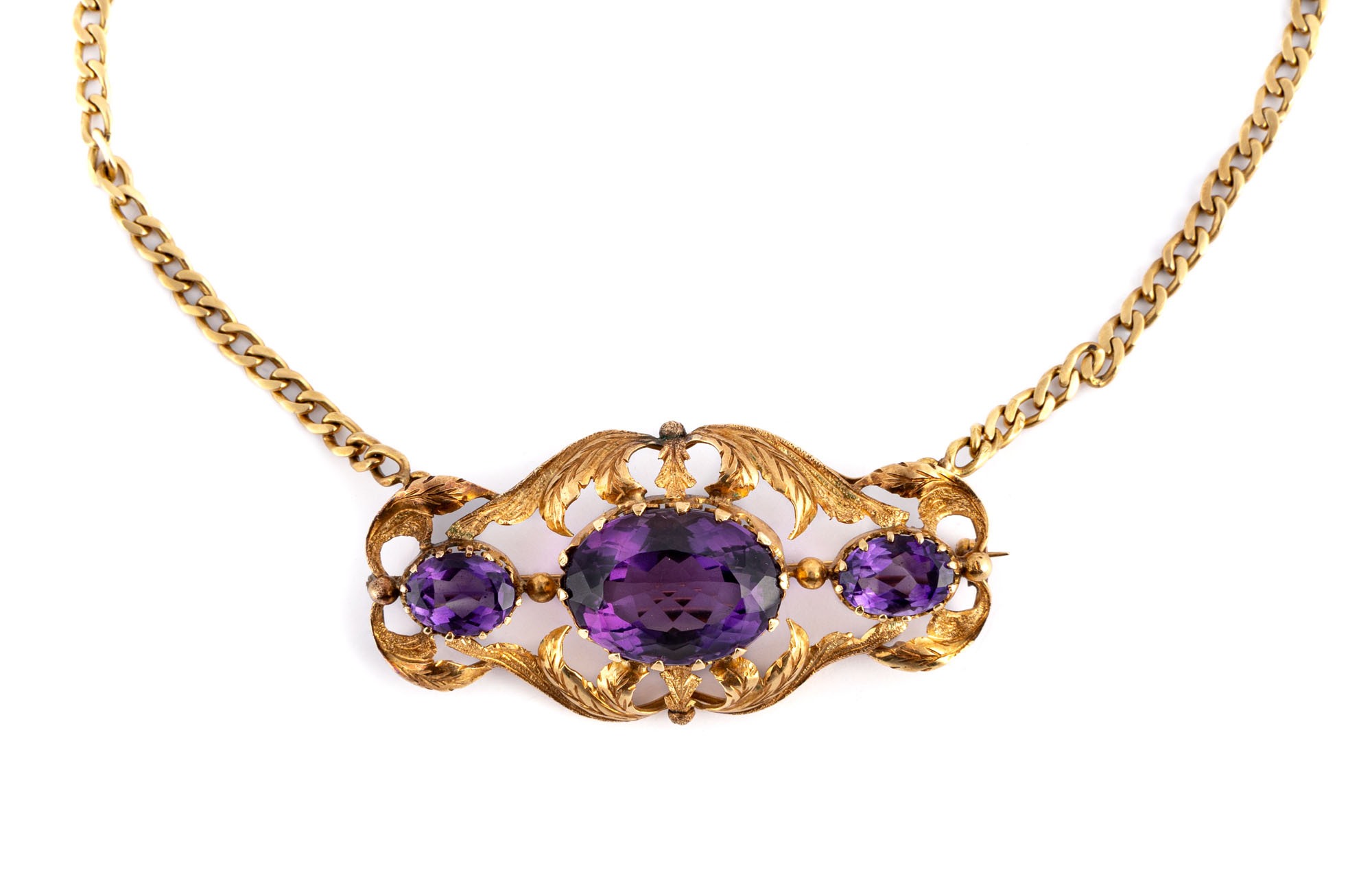 Flat link necklace in 18kt rose gold with a centerpiece embellished with three oval-cut amethysts of ct 28.6 ca, decorated with leaf motifs. The centerpiece can also be used as a brooch