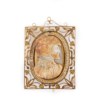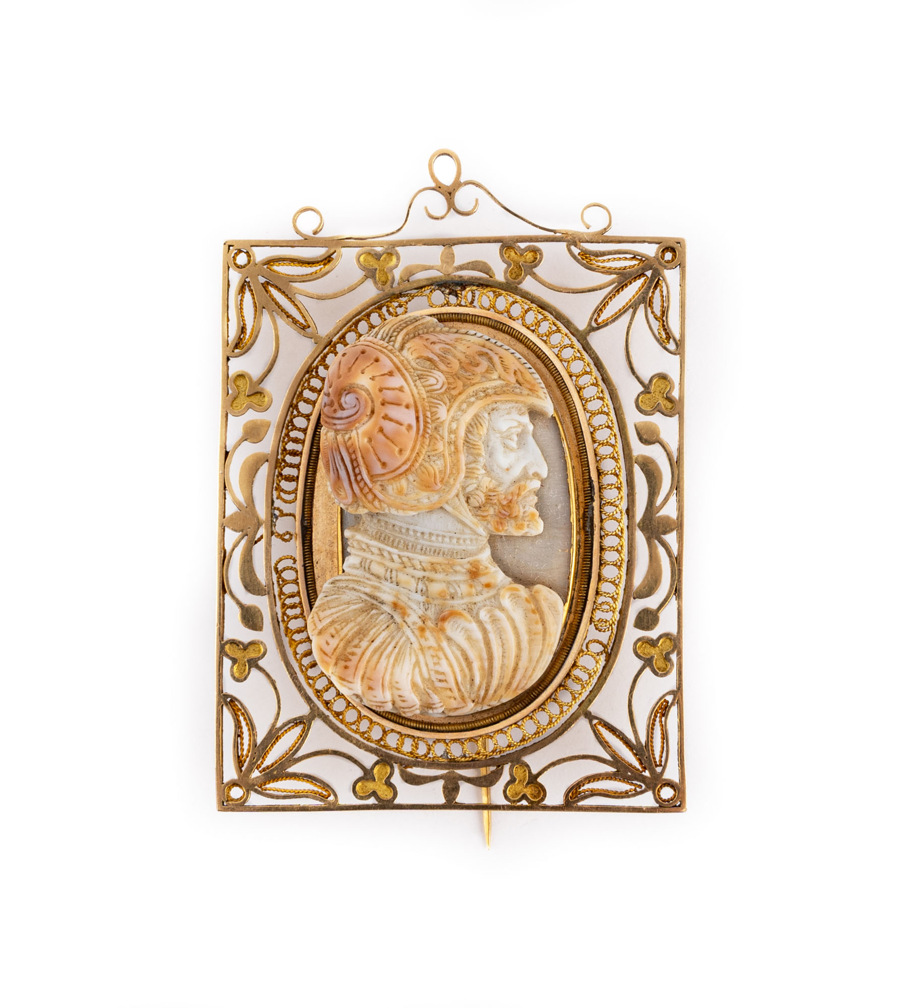 18kt rose gold brooch with floral motifs in a rectangular shape, with an oval shell cameo in the center depicting a man, probably a soldier