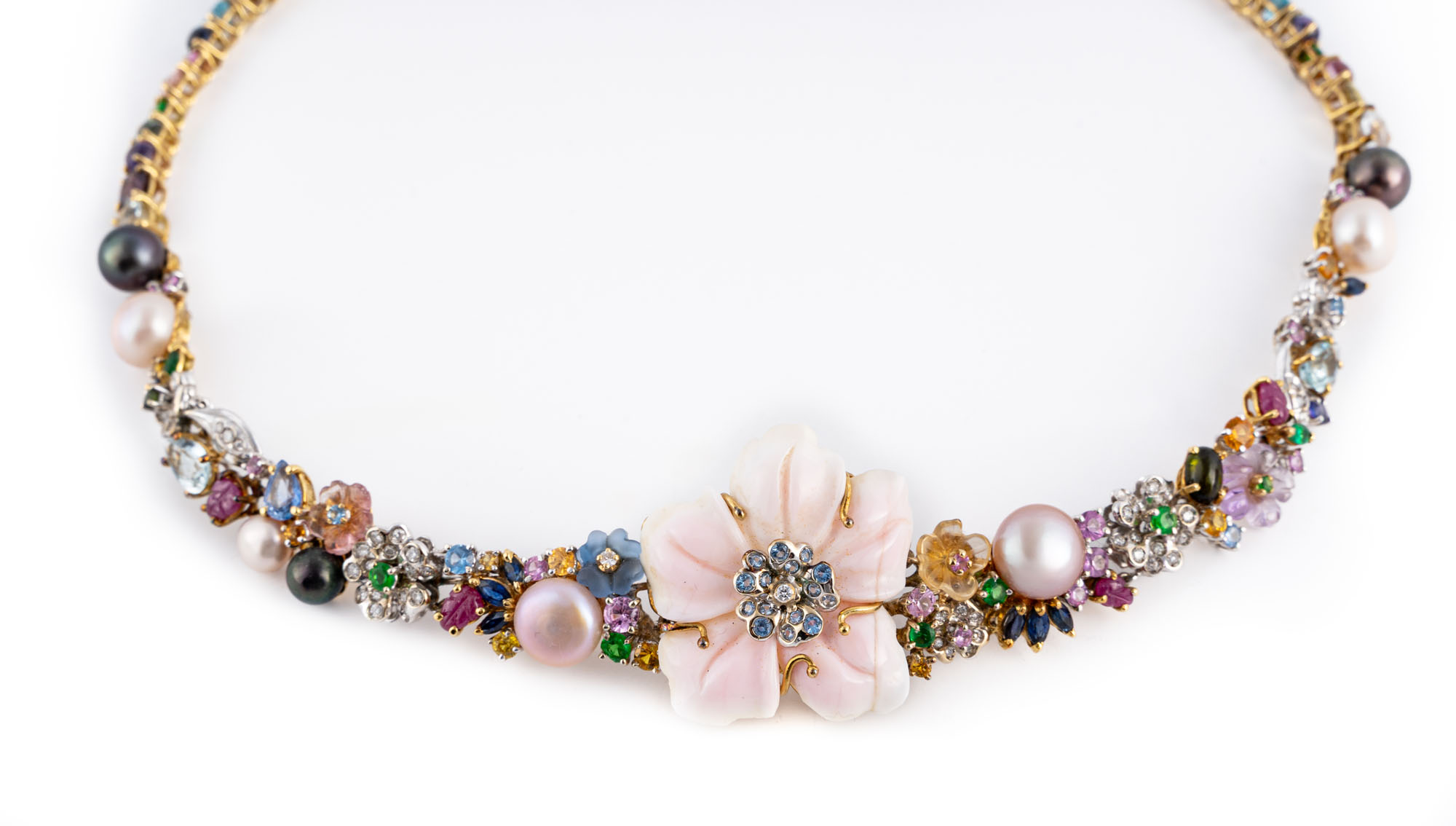 Semi-rigid choker necklace in 18kt yellow gold with colored stones of various cuts, pearls, and diamonds, embellished with a central shell flower Signed Santagostino Gr 59.7