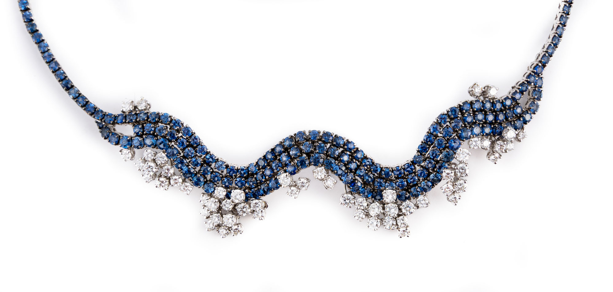 Semi-rigid choker necklace in 18kt white gold embellished with round-cut sapphires of ct 17.00 ca and brilliant-cut diamonds of ct 4.05 ca