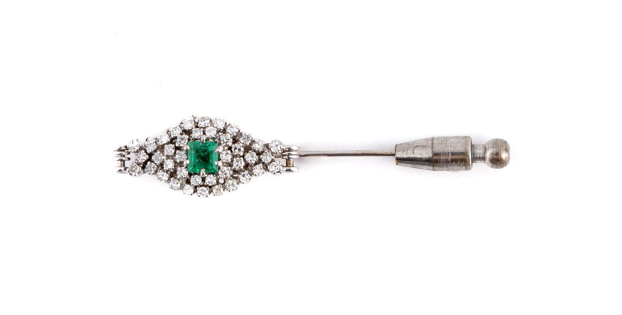 18kt white gold brooch with a geometric shape and a rectangular cut emerald of ct 0.24 in the center, surrounded by huit huit cut diamonds of ct 0.60 ca