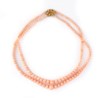 Two-strand necklace with peau d'ange coral beads ranging in size from 4 mm to 12 mm. 18kt satin-finish yellow gold clasp in the shape of vine leaves embellished with small dot-like elements