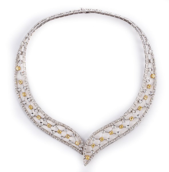 Semi-rigid choker necklace in 18kt white gold, composed of two intricate links embellished with white and fancy yellow brilliant-cut diamonds of tct 6.32 ca