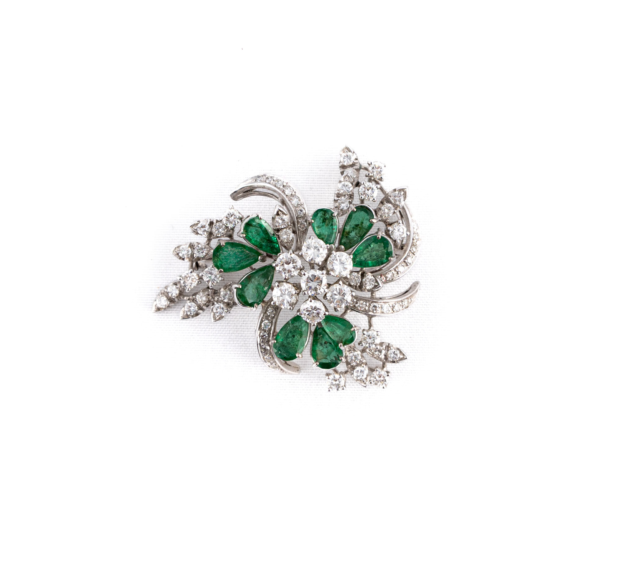 18kt white gold brooch with floral motif, embellished with brilliant-cut diamonds of ct 2.95 ca and teardrop-cut emeralds of ct 4.0 ca