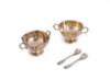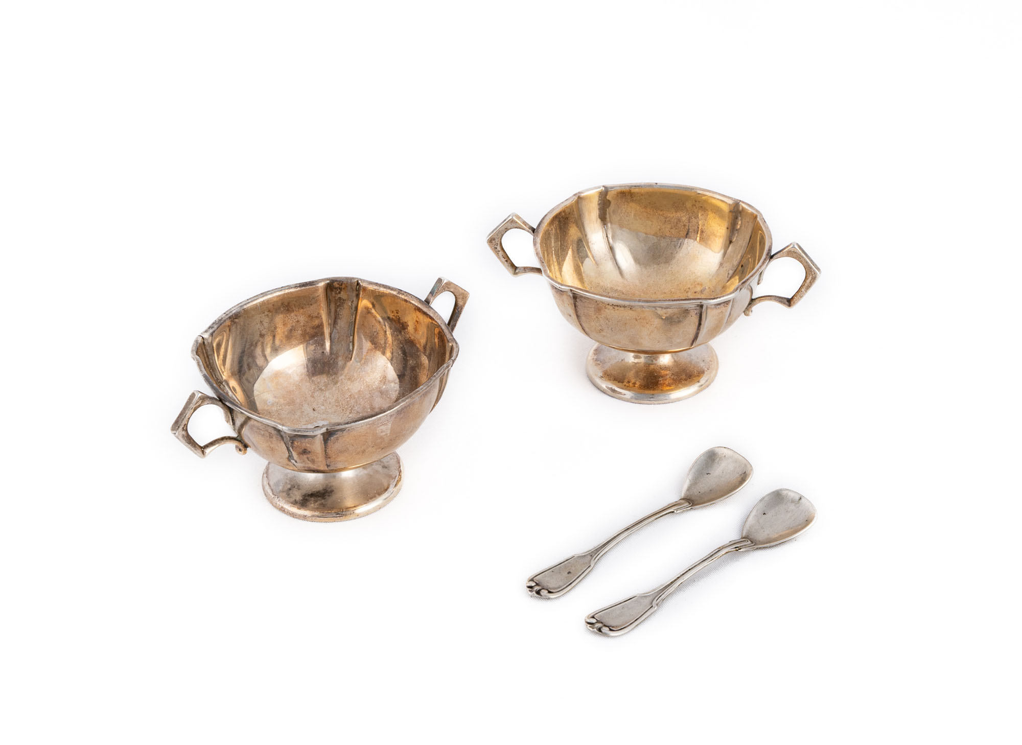 Comprising two square double-handled salt cellars in 925 silver and two teaspoons in 800 silver