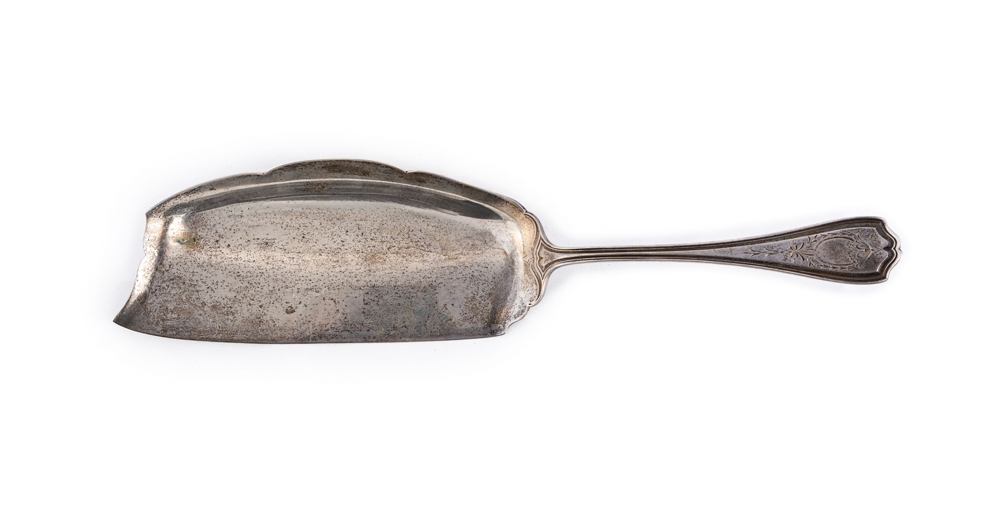 Broad, slightly concave shape with ornamental engravings on the handle