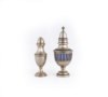 Two silver sugar sprinklers, one with a smooth body perforated with a railing pattern and a blue glass bowl inside, the other with a smooth body and decorative details along the edges