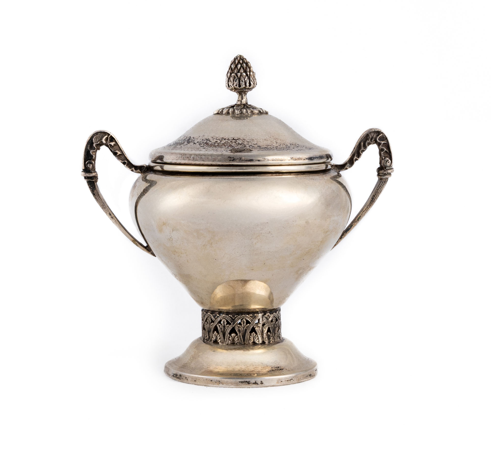 Cup-shaped with a pedestal base decorated with floral and geometric motifs, curved side handles. Domed lid topped with a pine cone-shaped knob.