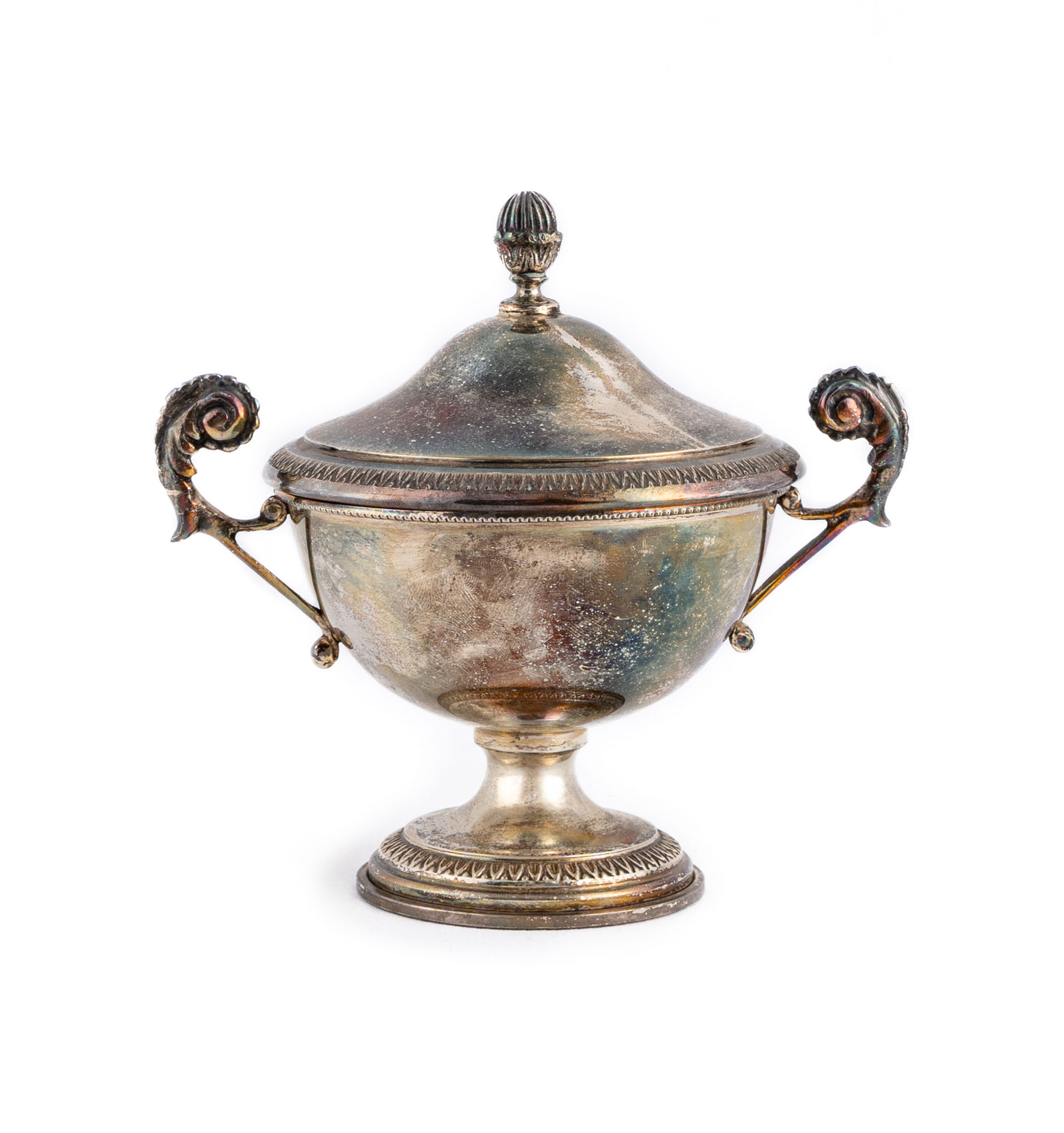 Cup-shaped with palmette-decorated base, curved handles with scroll ends, dome-shaped lid decorated with a palmette border surmounted by a knob