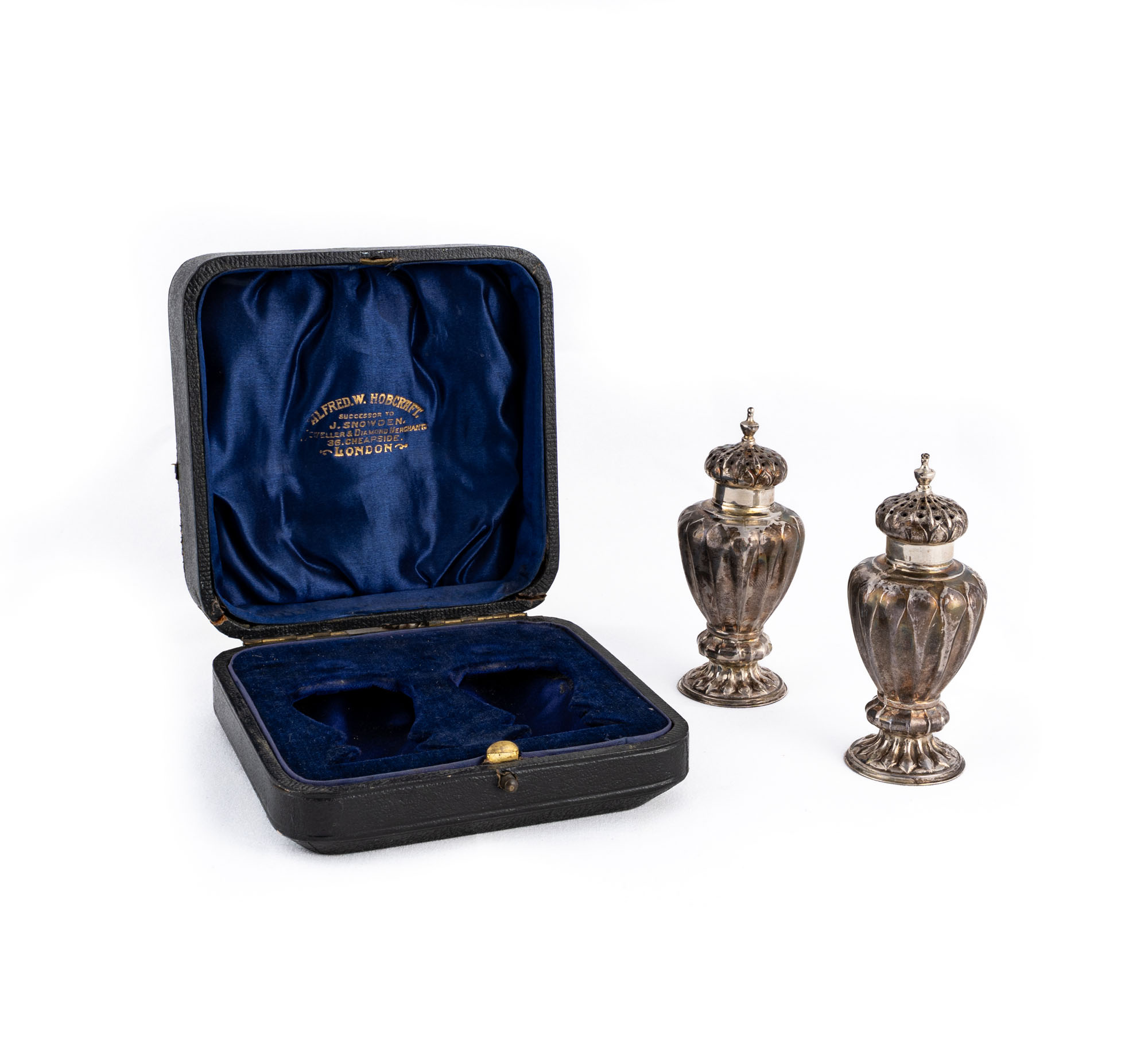 Both decorated with vertical grooves in what is probably the original box, signed Alfred W. Hobcraft, London