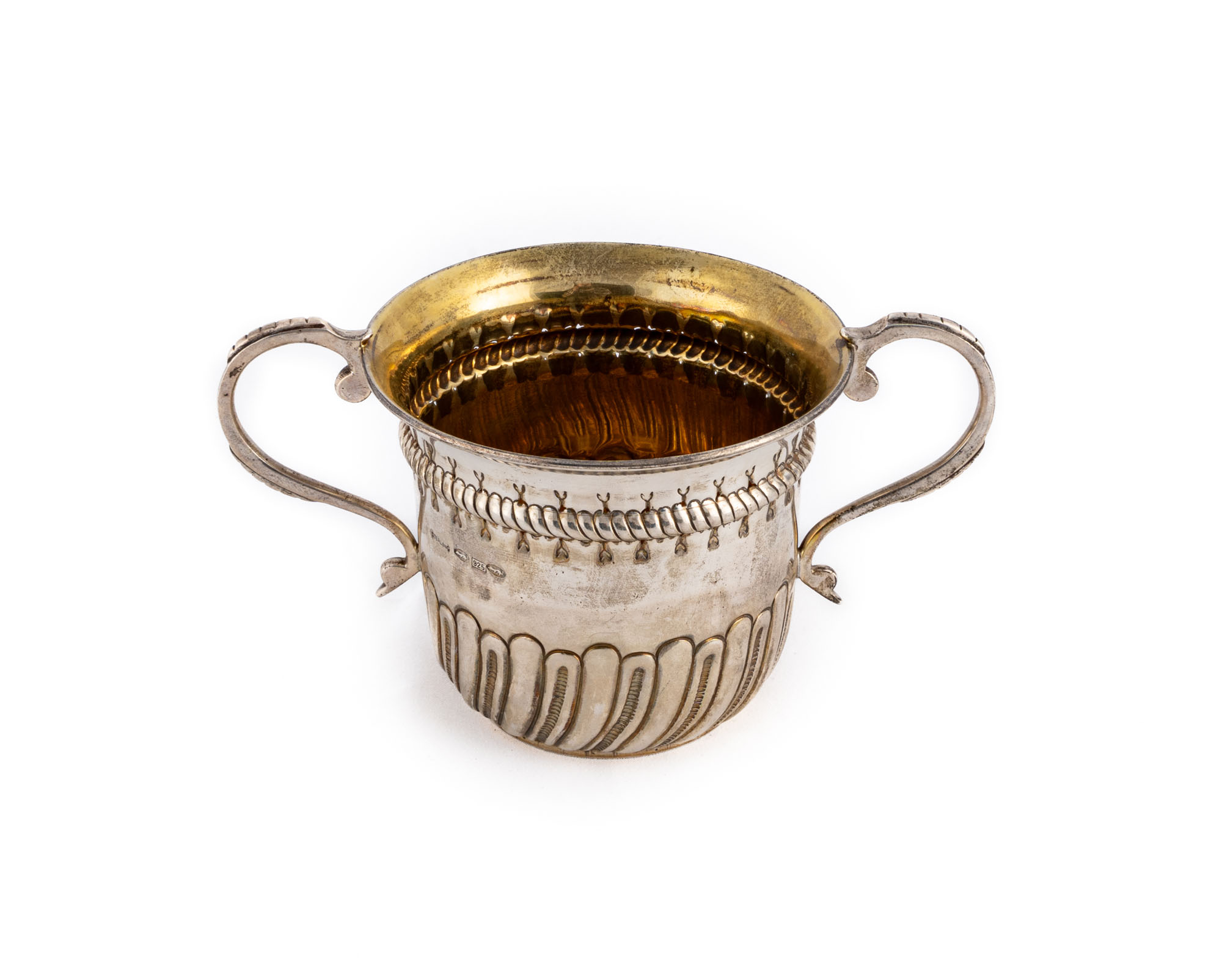 Porringer cup with two silver handles and vermeil interior. The upper part is embellished with a border decorated with a twisted rope motif, while the lower part features vertical ribbed decorations.