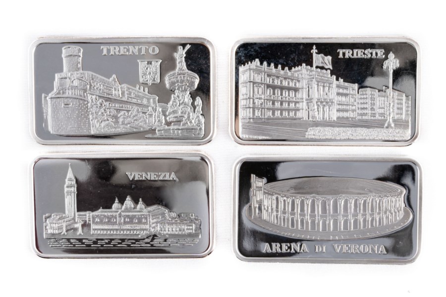 Set of 4 plates weighing 31 g each in 999 silver depicting: Trento, the Verona Arena, Venice, and Trieste