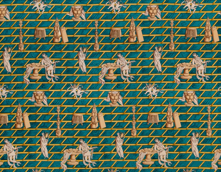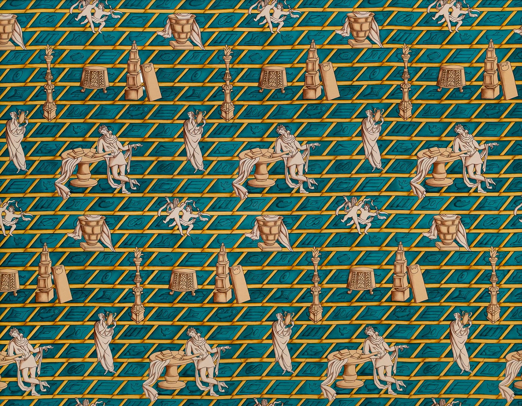 Fabric printed with architectural and figurative motifs by Giò Ponti, manufactured by Avigdor, Italy, second half of the 20th century 110 x 140 cm circa Mounted on a wooden panel PROVENANCE: Private collection, Piacenza
