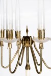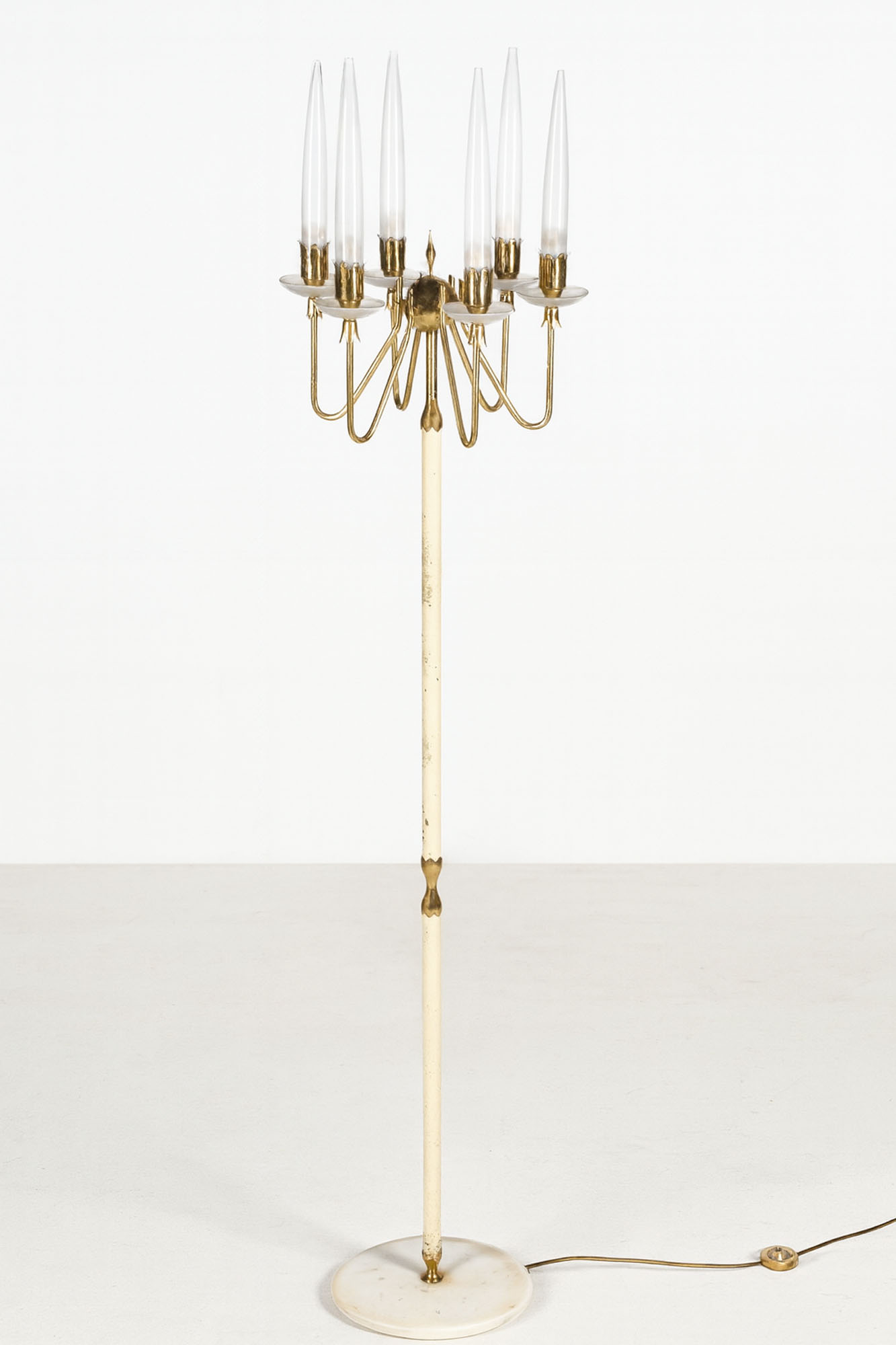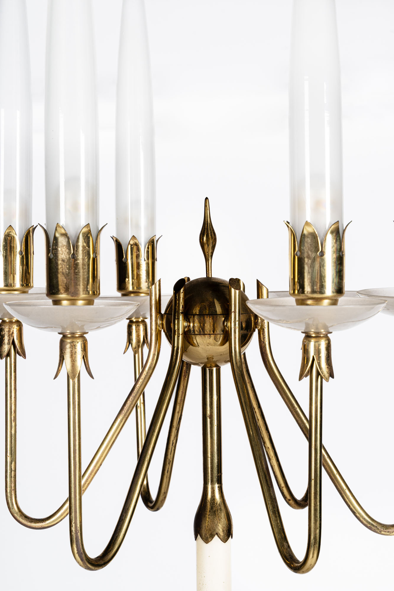 Brass and lacquered brass structure with marble base. Satin opal glass diffusers and curved crystal saucers, manufactured by Arredoluce, Italy, 1953