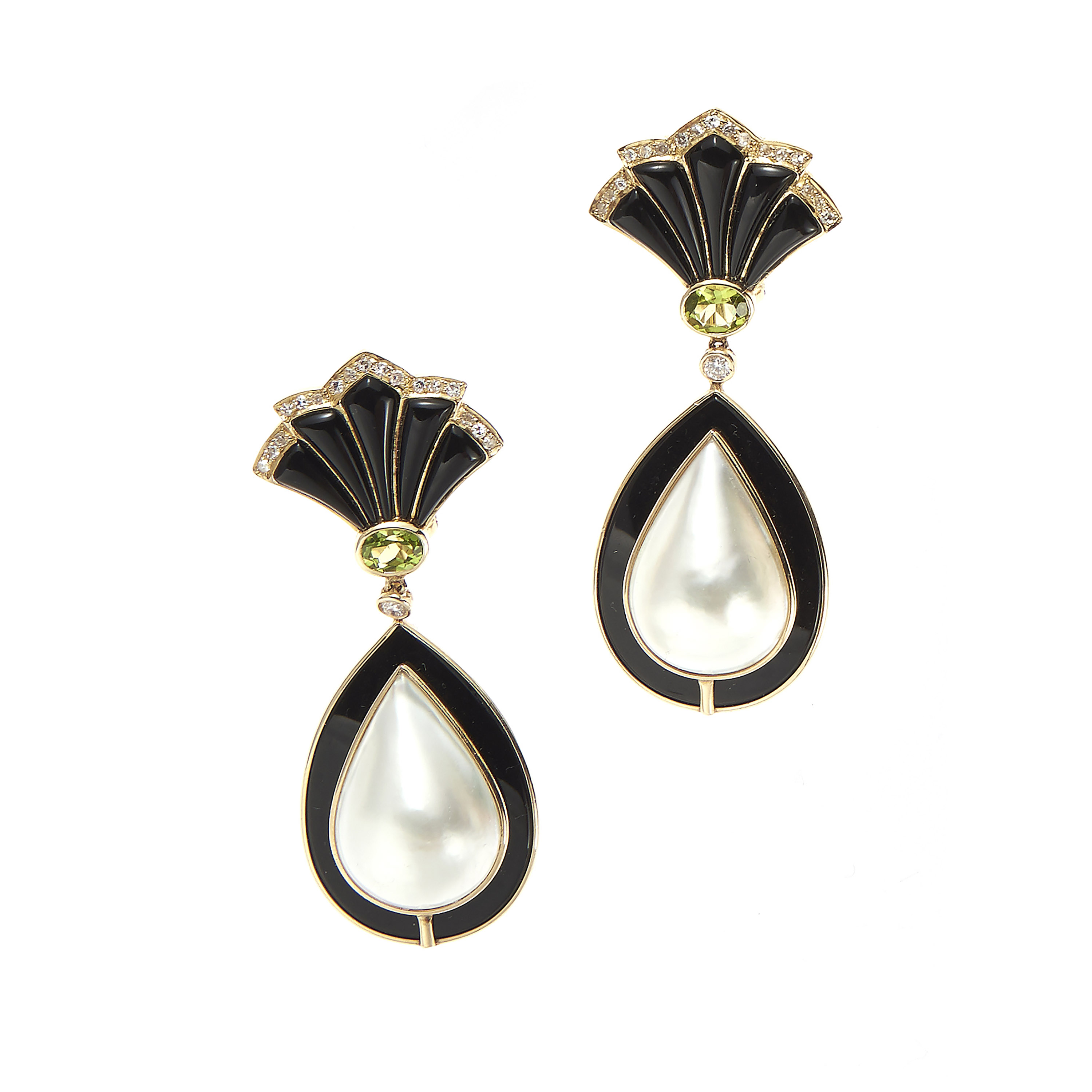 Pair of 14kt gold, diamond, onyx, green gemstone and mabè pearls pendant earrings