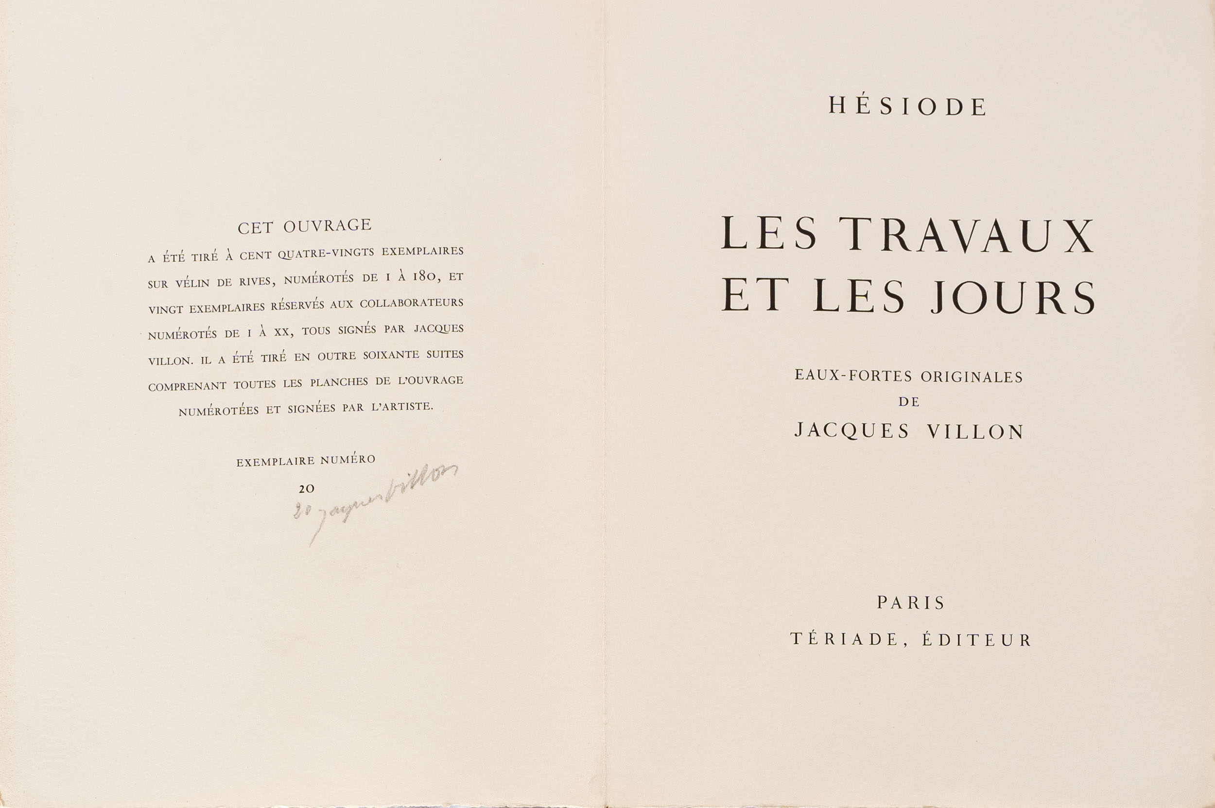 Libro d'artista composto da 23 acqueforti di cui 19 in bianco e nero (12 in doppia pagina) e 4 a colori (3 in doppia pagina), es. 20/180 su una tiratura complessiva di 180 esemplari in numeri arabi e 20 esemplari in numeri romani, Editions Verve, Parigi